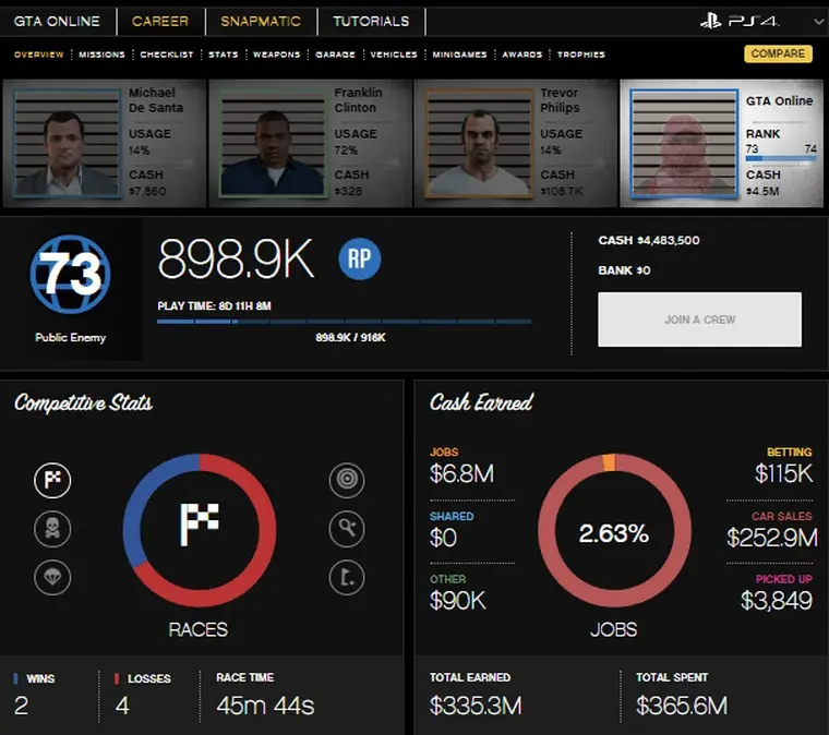 [PS4] GTA 5 Modded Account $360 Million (4M Cash + 115 Cars + 8 Outfits) | RP Rank 70 | Full Access | Instant Delivery | Verified Account | OB3