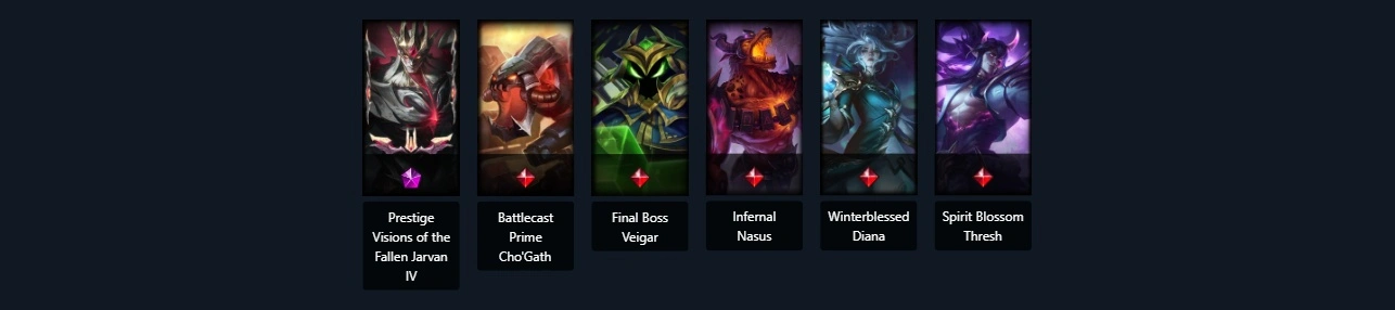 UnRanked┃123 skins┃171 Champs┃(1 Prestige) Prestige Visions of the Fallen Jarvan IV Winterblessed Diana Spirit Blossom Thresh Final Boss Veigar Battlecast Prime Cho'Gath Infernal Nasus Soul Fighter Pyke