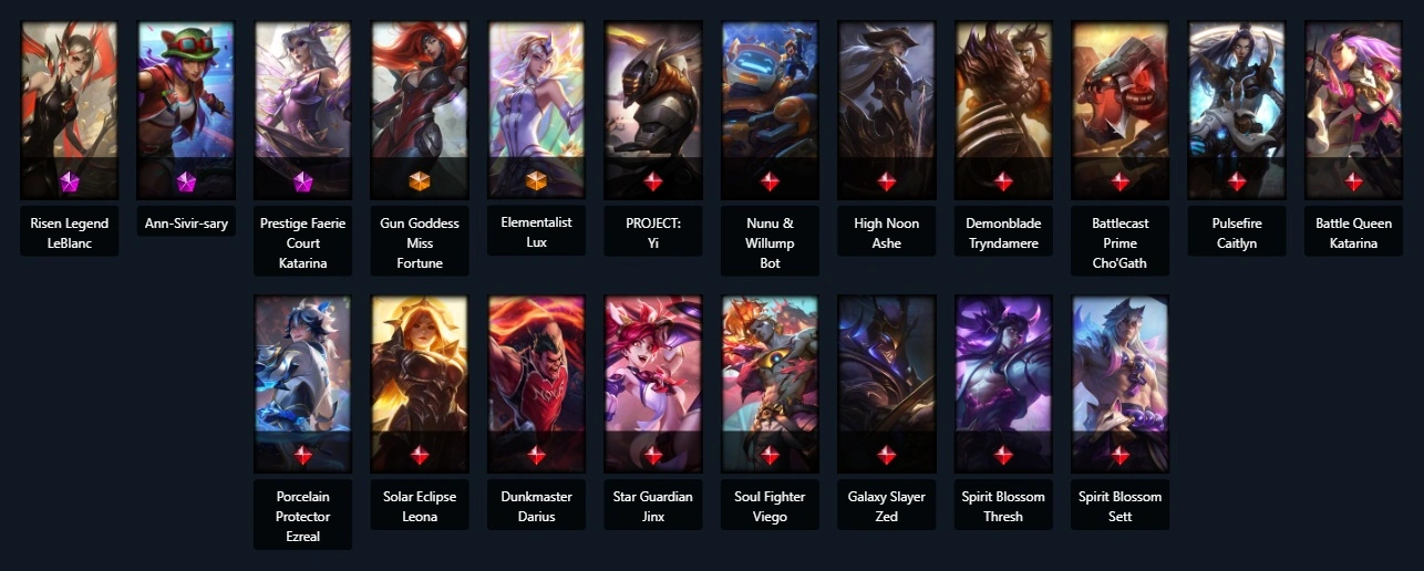 UnRanked┃123 skins┃171 Champs┃(3 Mythic) Prestige Faerie Court Katarina Soul Fighter Viego High Noon Ashe Spirit Blossom Sett Porcelain Protector Ezreal PROJECT: Yi Dunkmaster Darius
