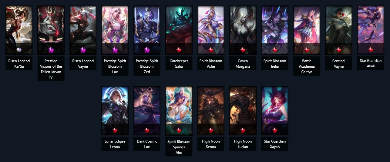 UnRanked┃75 skins┃68 Champs┃(4 Mythic) Risen Legend Vayne Prestige Spirit Blossom Lux Prestige Spirit Blossom Zed Prestige Visions of the Fallen Jarvan IV Battle Academia Caitlyn Gatekeeper Galio High Noon Lucian