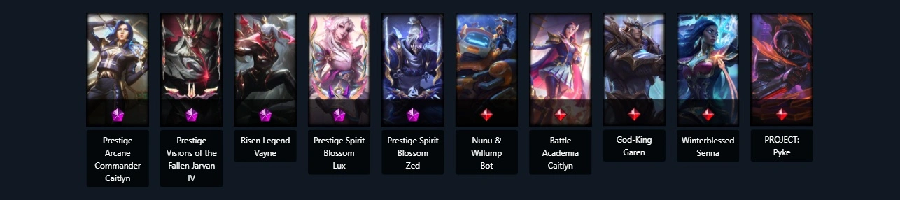 UnRanked┃83 skins┃126 Champs┃(5 Mythic) Risen Legend Vayne Prestige Spirit Blossom Lux Prestige Spirit Blossom Zed Prestige Visions of the Fallen Jarvan IV Prestige Arcane Commander Caitlyn Battle Academia Caitlyn Nunu & Willump Bot