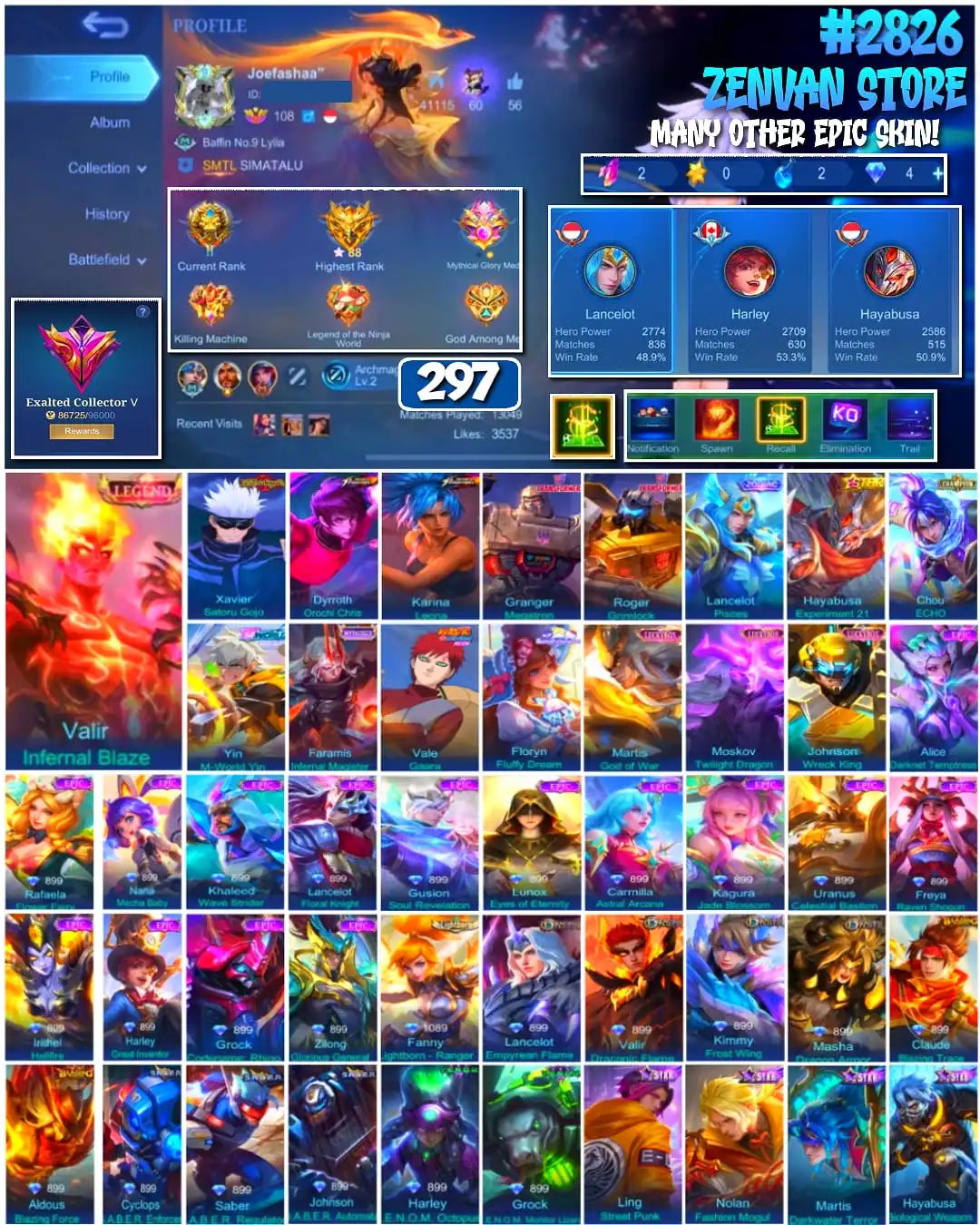#2826 🔥 297 Skins 🔥 Legend Valir 🔥 Jujutsu Kaisen Gojo 🔥 Transformers Granger & Roger 🔥 M-World Yin 🔥 Sanrio Floryn 🔥 KoF Karina & Dyroth 🔥 Many Limited 🔥 Many Epic 🔥 Safe Account ✅