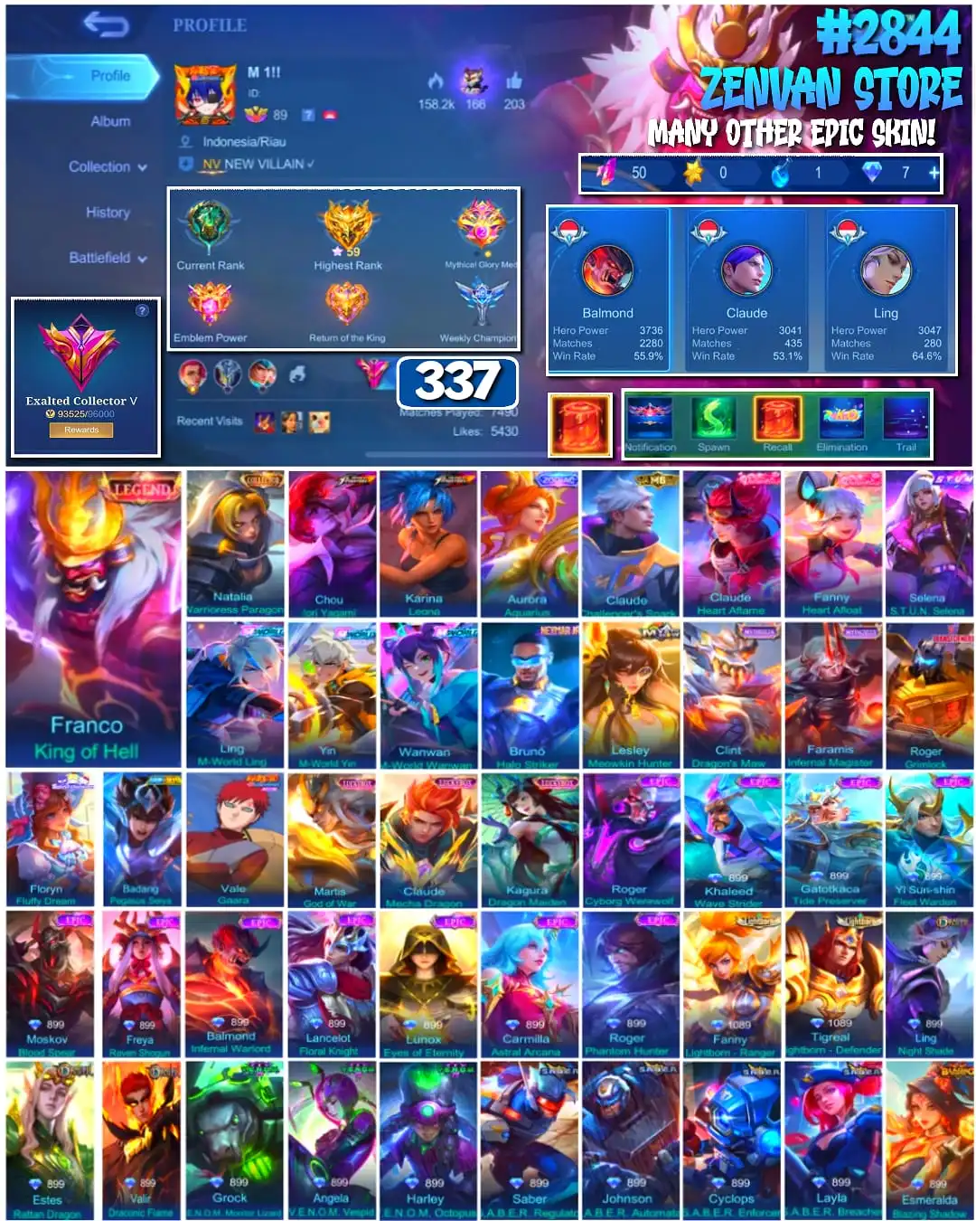 #2844 🔥 337 Skins 🔥 Legend Franco 🔥 Collector Natalia 🔥 Full M-World 🔥 Nyenmar Jr, Stun Selena 🔥 Transformers Roger 🔥 Sanrio Floryn 🔥 Many Limited 🔥 Many Epic 🔥 Safe Account ✅