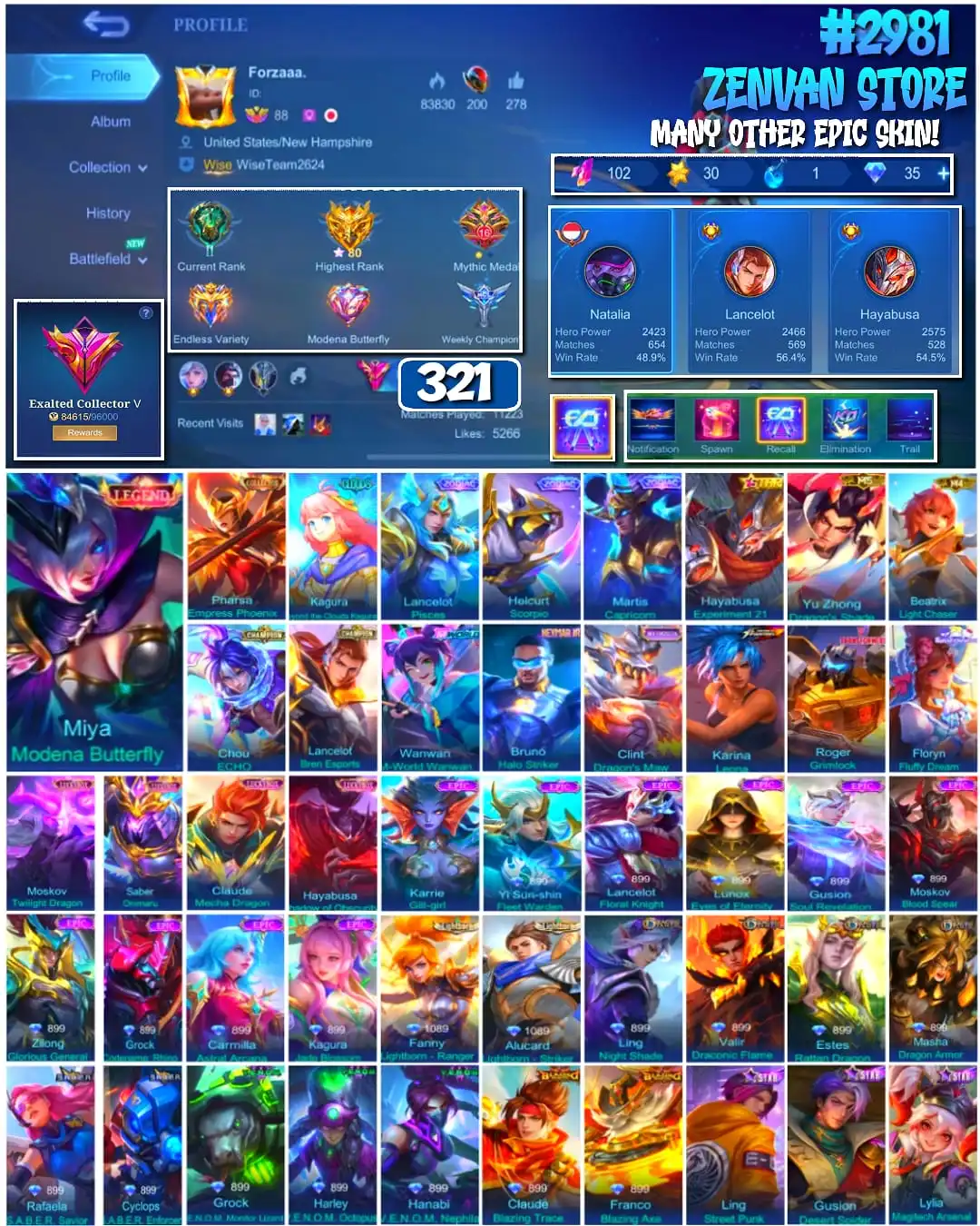 #2981 🔥 321 Skins 🔥 Legend Miya 🔥 Collector Pharsa 🔥 Clouds Kagura 🔥 M-World Wanwan 🔥 Transformers Roger 🔥 KoF Karina 🔥 Many Limited 🔥 Many Zodiac 🔥 Many Epic 🔥 Safe Account ✅