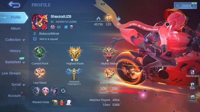 Logic Says Buy Mobile Legends ⸱ Level 62 | 108 Heroes | 266 Skins | Mythic Glory 59 Stars | Exclusive Collab Skins(#A42889419f)