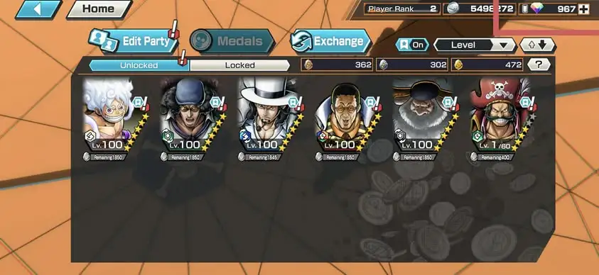 [3413][ ANDROID ONLY ] 6 EX META / 5 MAX / 972 Gems Android , 472 gold stones / Kizaru + Kuzan + Saturn + Luffy Light + Lucci + Roger , Solo Fresh , Many item pieces