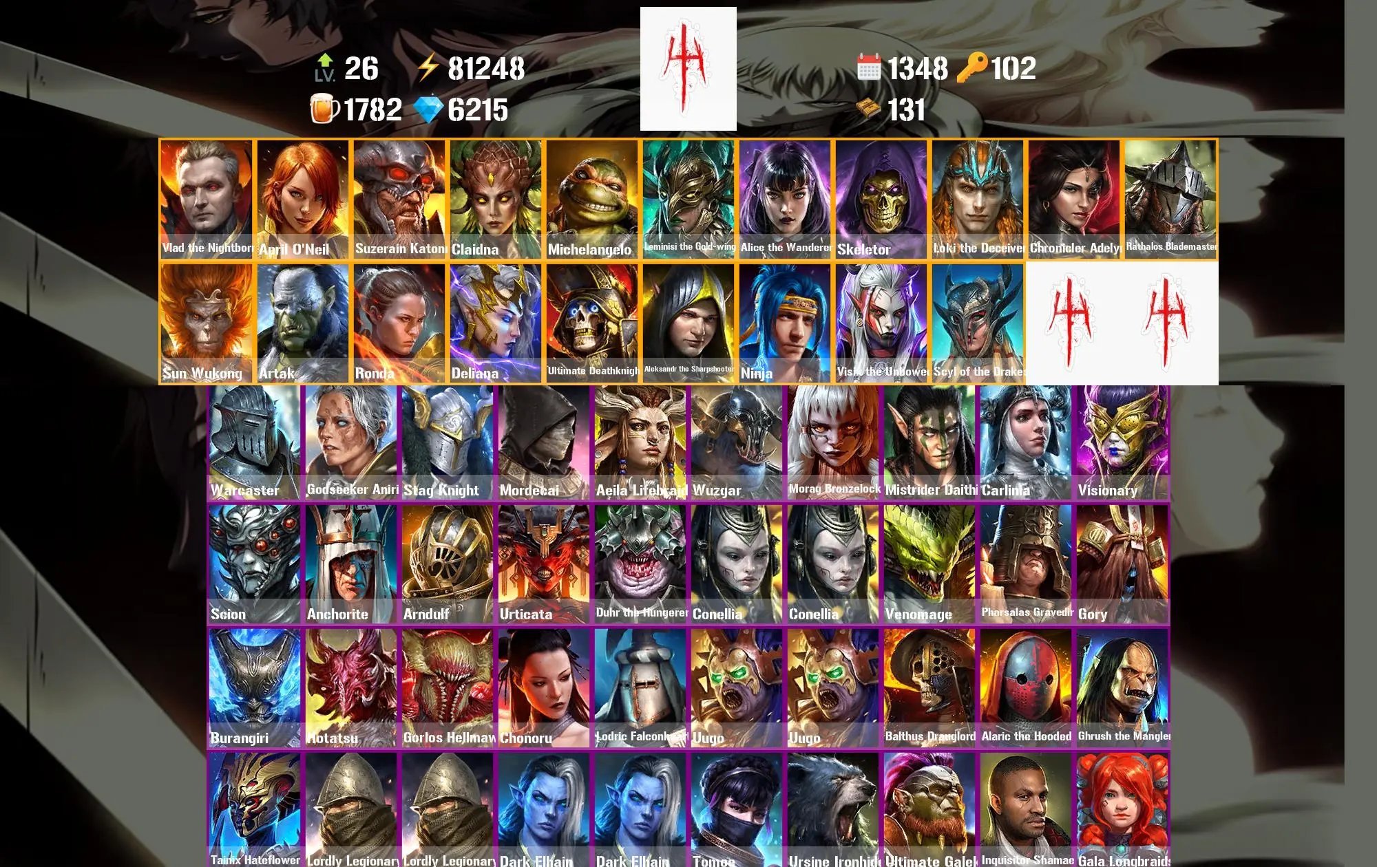 1348 Days 81.2k Energy Vlad the Nightborn ⸱ April O'Neil ⸱ Suzerain Katonn ⸱ Claidna ⸱ Michelangelo ⸱ Warcaster ⸱ Godseeker Aniri ⸱ 55.0m Silver ⸱ 6.2k Gems