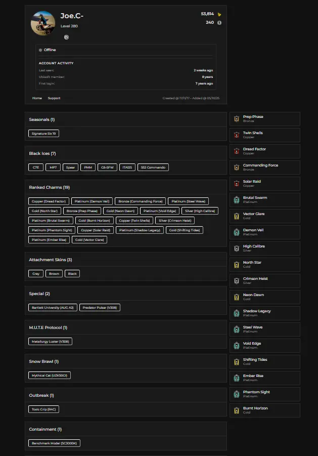 🎮 PC UBISOFT | LEVEL 280 | 53K RENOWN | 7 BLACK ICE | 19 RANKED CHARMS | 5 LEGENDARY | 30 EPIC SKINS | 8-YEAR VETERAN