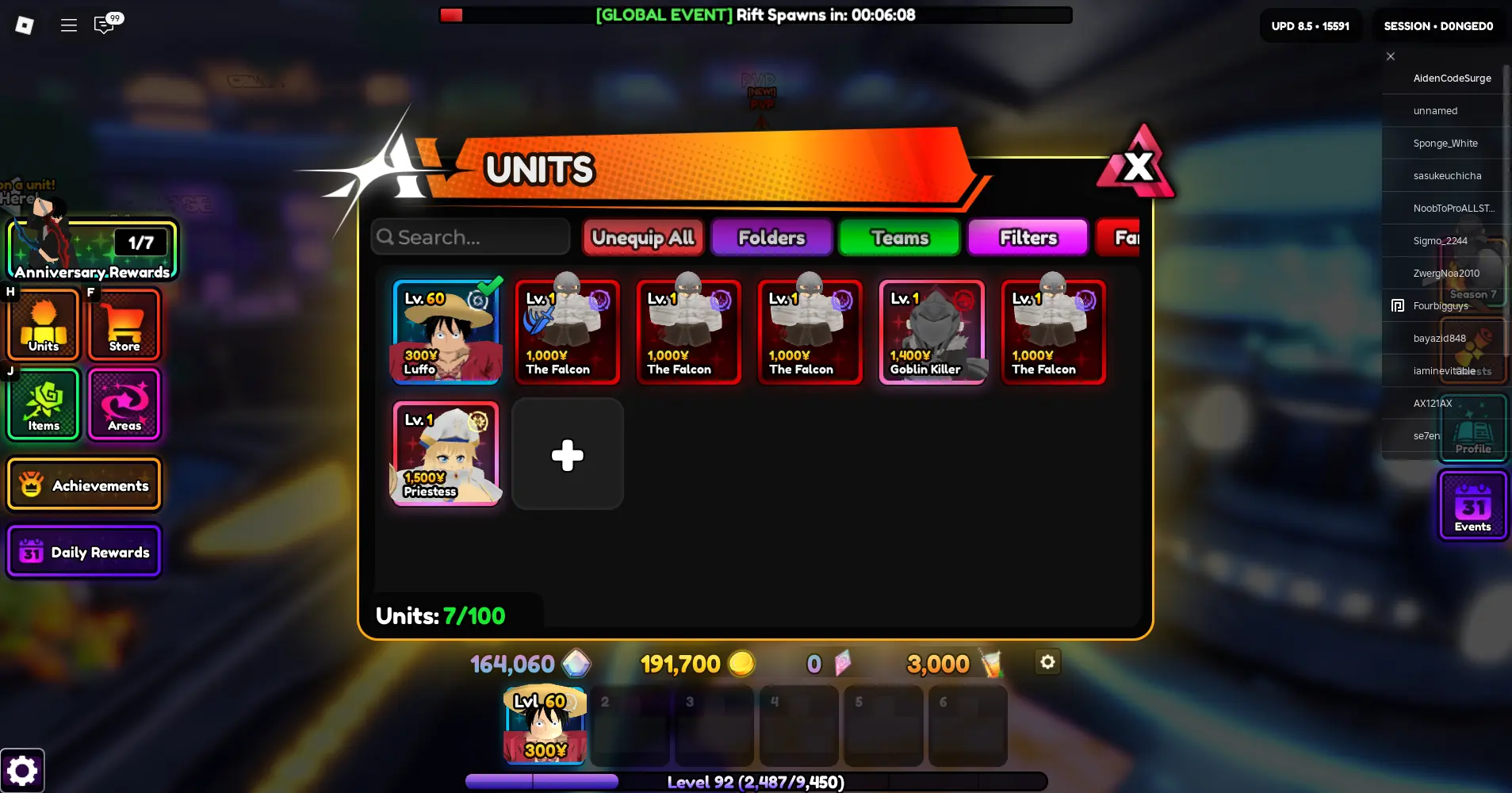 Anime Vanguards ⸱ 92LV ⸱ 164K Gems ⸱ 225 Trait Rolls ⸱ The Falcon ⸱ Priestess ⸱ Goblin Killer INSTANT DELIVERY