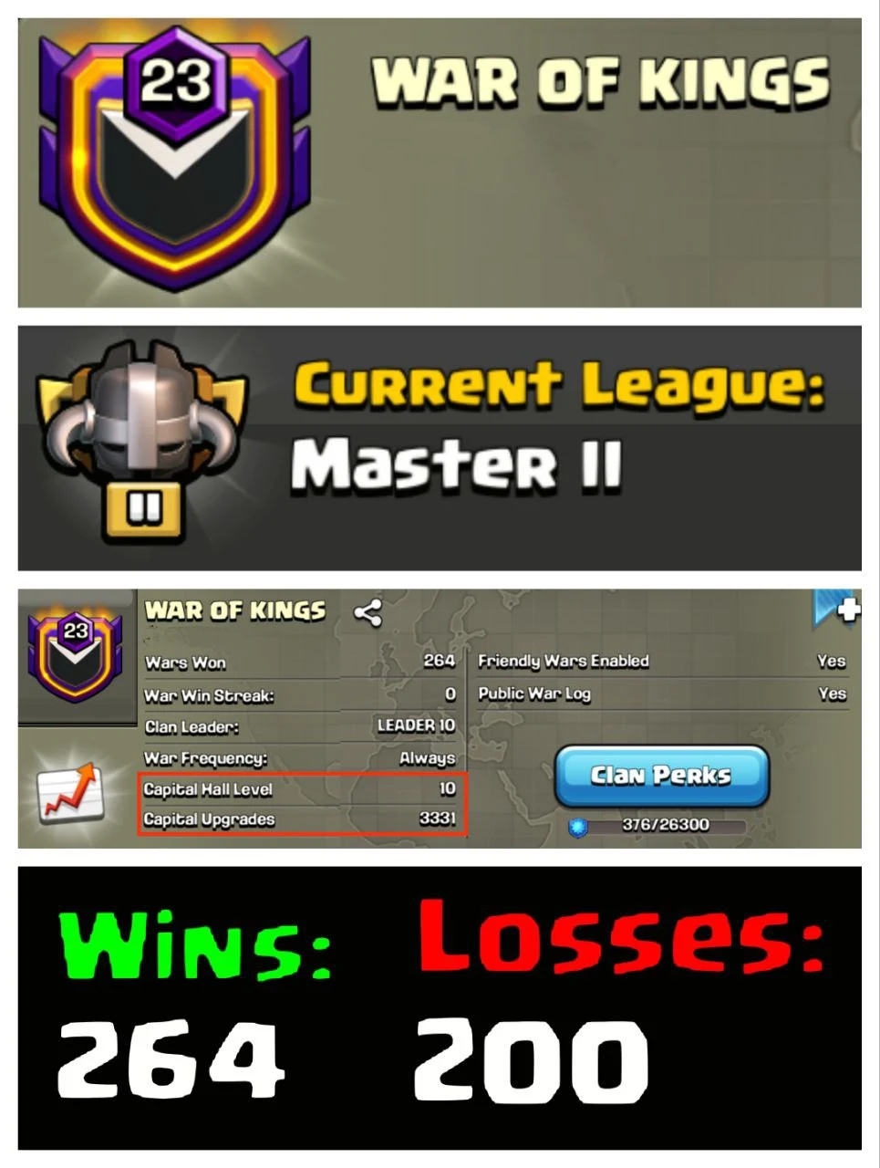 🍀GREAT DEAL🍀 ❤🔥OP LEVEL 23 ENGLISH CLAN 🔺 OP NAME :WAR OF KINGS ☘️ LEAUGE : MASTER 2 🔥 CLAN CAPITAL : 10 MAX 🍁 WINS : 264 | LOSS : 200❣️BEST CLAN BUY NOW ⚡ FAST DELIVERY🚚