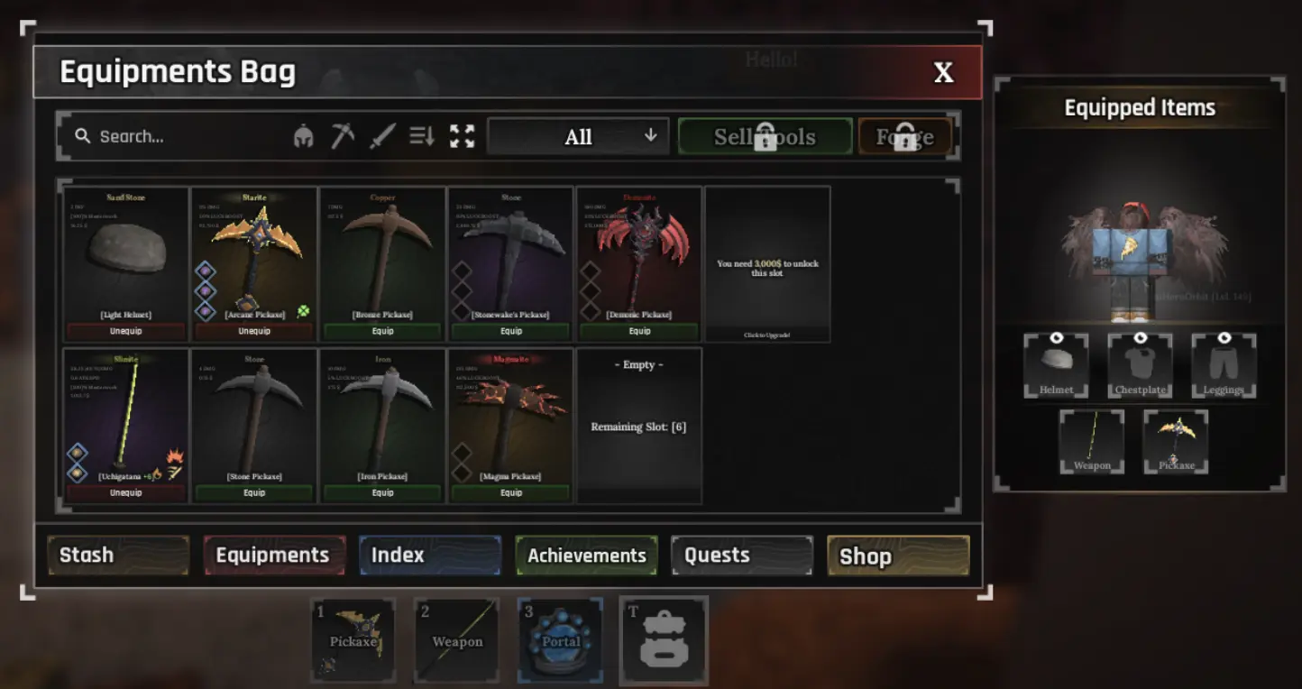 ✅ Instant Delivery 👺 Demon Race ⚔️ Lvl 142 💰 877K Coins ⛏️ Demonic + Magma + Arcane Pickaxes 🗡️ Uchigatana 🛡️ Copper Light Helmet 👿【THE FORGE】