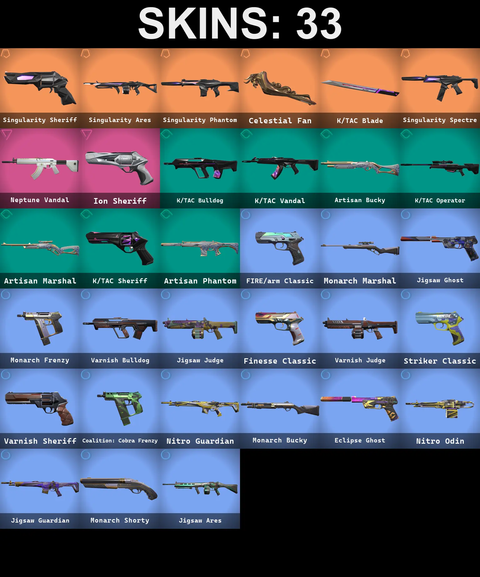 33 SKINS | 2 KNIFE | CELESTIAL FAN | ION SHERIFF | NEPTUNE VANDAL | SINGULARITY PHANTOM | SINGULARITY SHERIFF | SINGULARITY SPECTRE | SINGULARITY ARES | K/TAC BLADE | K/TAC BULLDOG | K/TAC VANDAL | ARTISAN BUCKY | K/TAC OPERATOR |