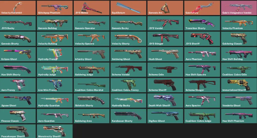 🔫 Skins (53): Velocity Karambit, Gaia’s Vengeance Vandal, .SYS Bucky, Genesis Bulldog, Genesis Operator, Genesis Bucky, .SYS Vandal, Transition Shorty, Velocity Phantom, Genesis Shorty, Velocity Bulldog, Velocity Spectre, Velocity Shorty, .SYS Stinger, .SYS Sheriff, Goldwing Classic, Eclipse Ghost, Hydrodip Frenzy, Infantry Ghost, Goldwing Ghost, Hush Ghost, Aero Phantom, Hue Shift Bulldog, Hue Shift Shorty, Hydrodip Judge, Goldwing Judge, Schema Vandal, Schema Odin, Hue Shift Spectre, Coalition: Cobra Odin, Aero Frenzy, Live Wire Frenzy, Coalition: Cobra Marshal, Coalition: Cobra Frenzy, Schema Sheriff, Schema Stinger, Immortalized Sheriff, Jigsaw Ghost, Hydrodip Guardian, Sidekick Shorty, Hydrodip Bucky, Death Wish Sheriff, Aero Spectre, Vendetta Ghost, Finesse Classic, Aero Guardian, Goldwing Ares, Karabasan Shorty, Digihex Ghost, Coalition: Cobra Judge, Hue Shift Phantom, Peacekeeper Sheriff, Monstrocity Sheriff