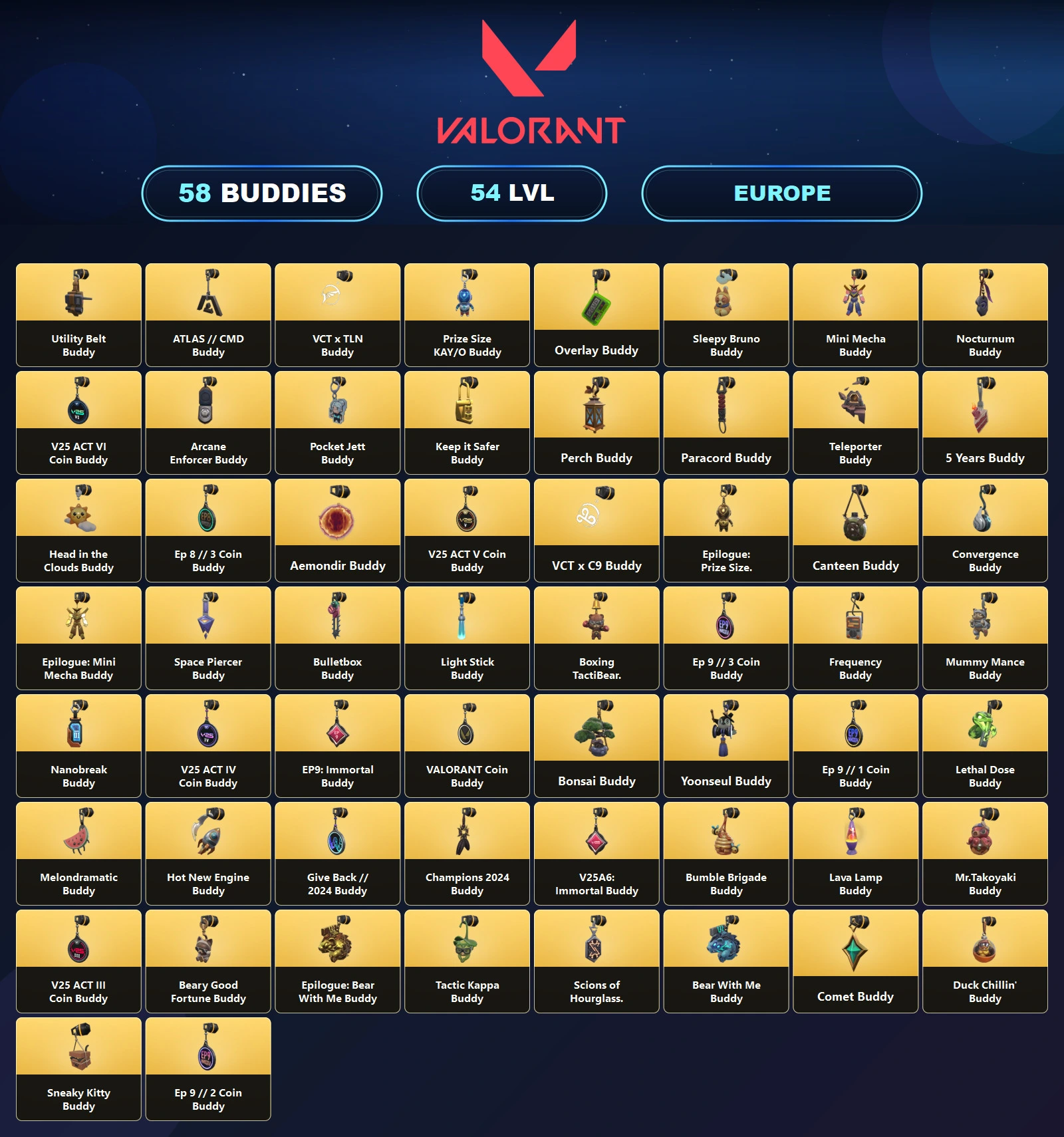 EU 🎯 103 Skins 🎪 54 Level ⛱ Champions 2024 Phantom 🐩 Champions 2024 Blade 🔥 Arcane Vandal 🛳 Elderflame Vandal ⛈ Reaver Vandal 💠 Prime//2.0 Phantom 🍋 Oni Phantom 👢 Unranked 🪐 12 Agents