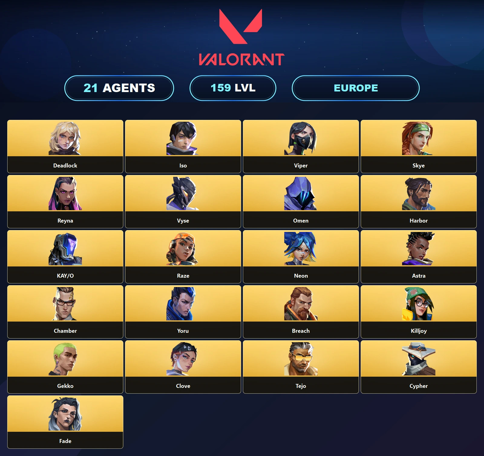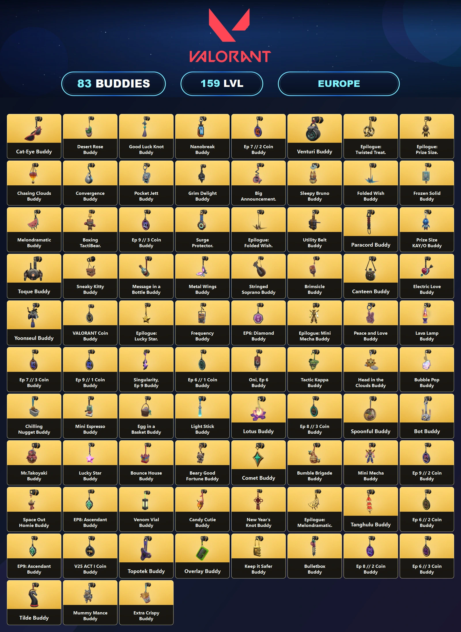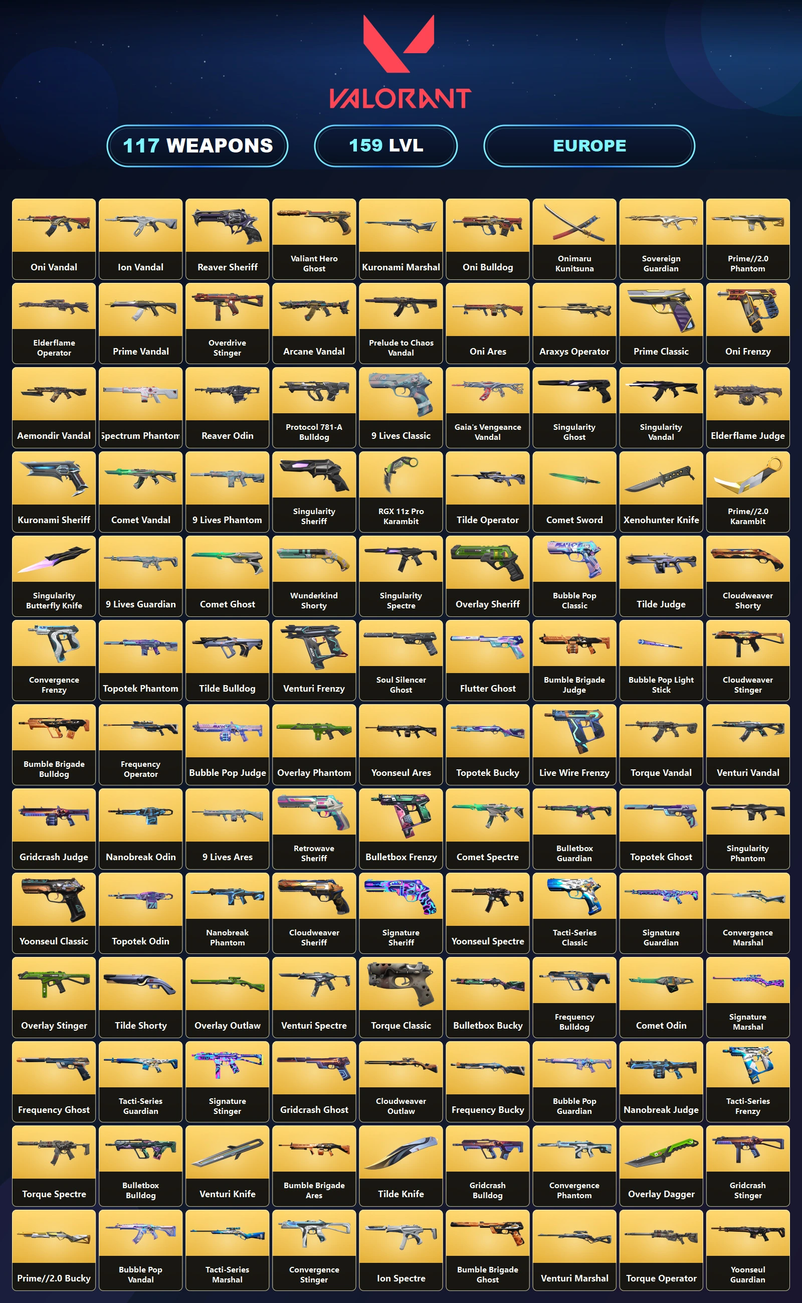 EU 👢 117 Skins 🧊 159 Level 🪙 Arcane Vandal 🐔 Prime//2.0 Phantom 🍋 Prime Vandal 🎪 Oni Vandal 🏁 Spectrum Phantom 👚 Gaia's Vengeance Vandal 🔥 Ion Vandal 🧿 Unranked 🌙 21 Agents