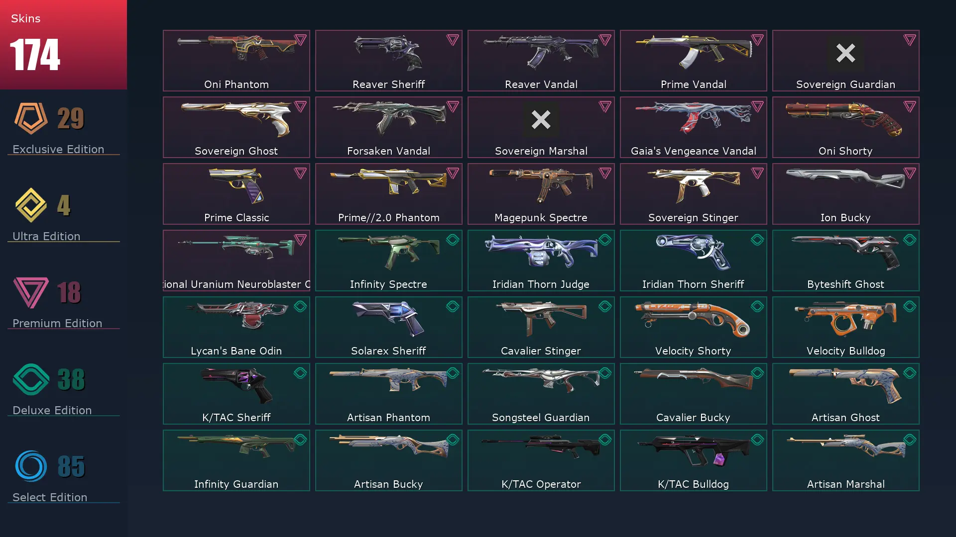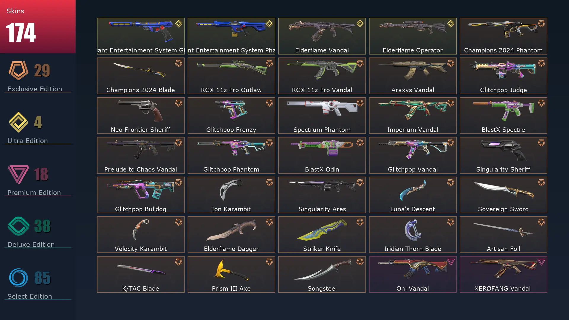 EU 👛 174 Skins 🤾♀️ 28 Agents 🥌 500 Level 🥼 Champions 2024 Phantom 🚎 Champions 2024 Blade 🍊 Magepunk Spectre 🌹 Glitchpop Bulldog 💉 Elderflame Dagger 😿 Reaver Sheriff 💋 Sovereign Stinger 😤 Glitchpop Frenzy 🦚 BlastX Spectre