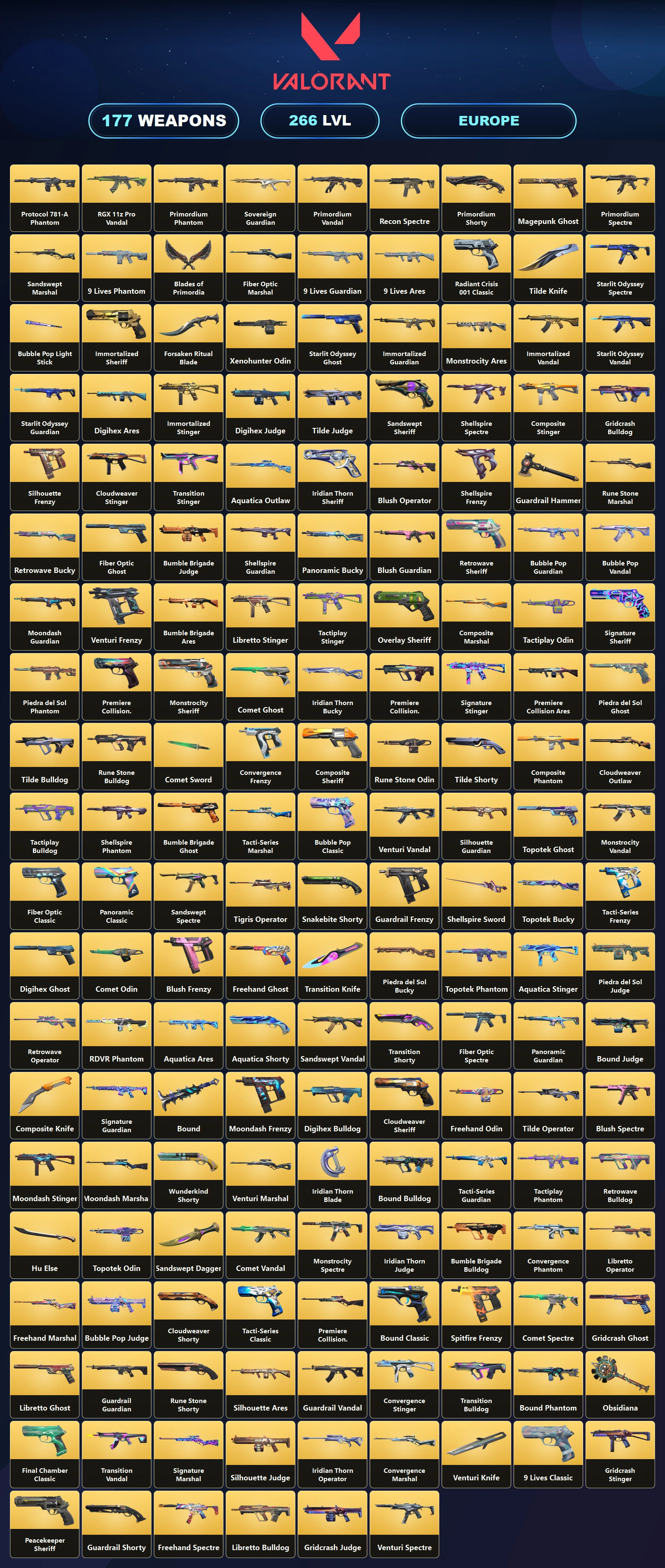 EU 🥪 177 Skins 🧿 266 Level ⛱ RGX 11z Pro Vandal 🍒 Transition Vandal 👢 Transition Knife 👚 Transition Stinger 🎪 Premiere Collision Classic 🏁 Premiere Collision Bulldog 🪐 Premiere Collision Ares 🎯 Gold 3 🔥 23 Agents