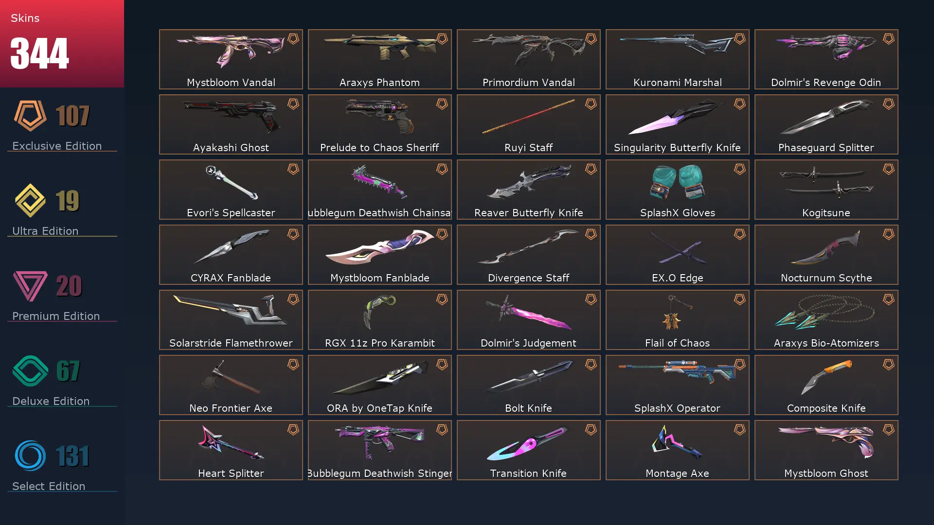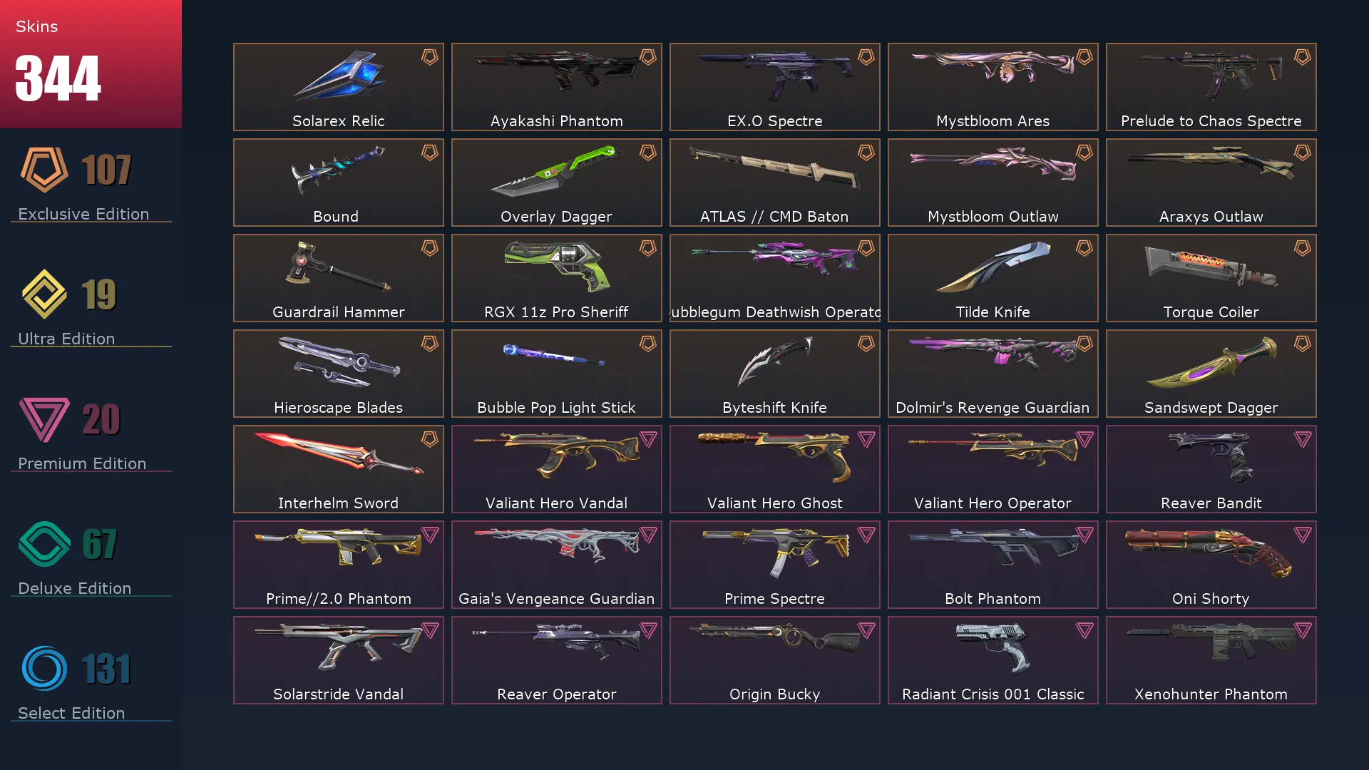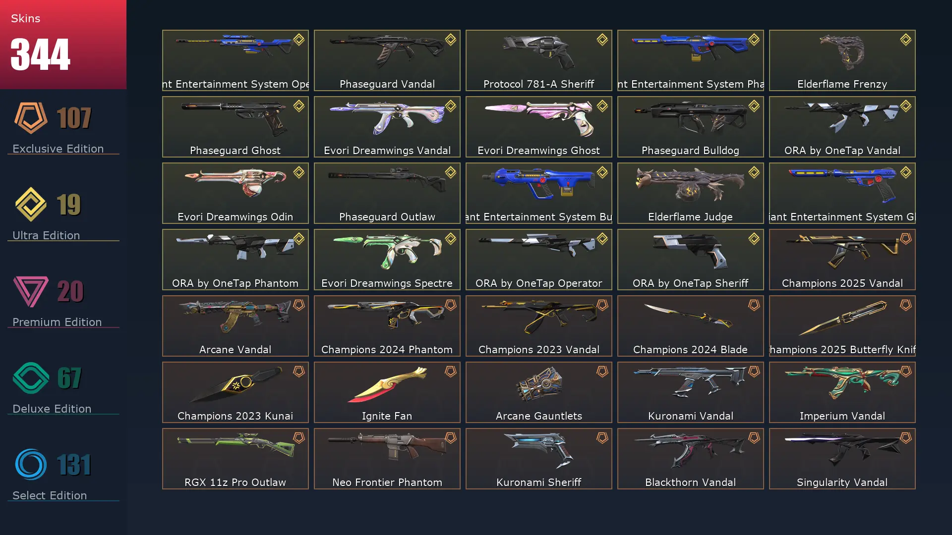 EU 🥪 344 Skins 🛳 Diamond 3 ⛈ 29 Agents ⛱ 459 Level 🤞 Champions 2025 Vandal 👢 Arcane Vandal 👚 Champions 2024 Phantom 🍒 Champions 2023 Vandal 🚍 Champions 2024 Blade 🐩 Champions 2025 Butterfly Knife 🐔 Champions 2023 Kunai 🎪 Ignite Fan