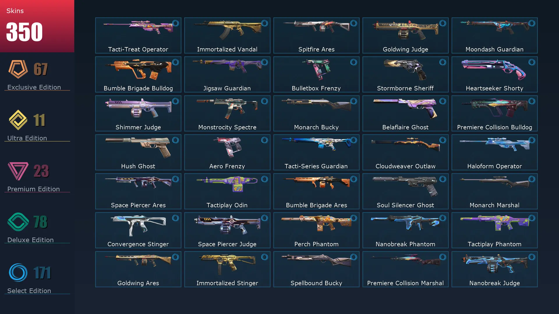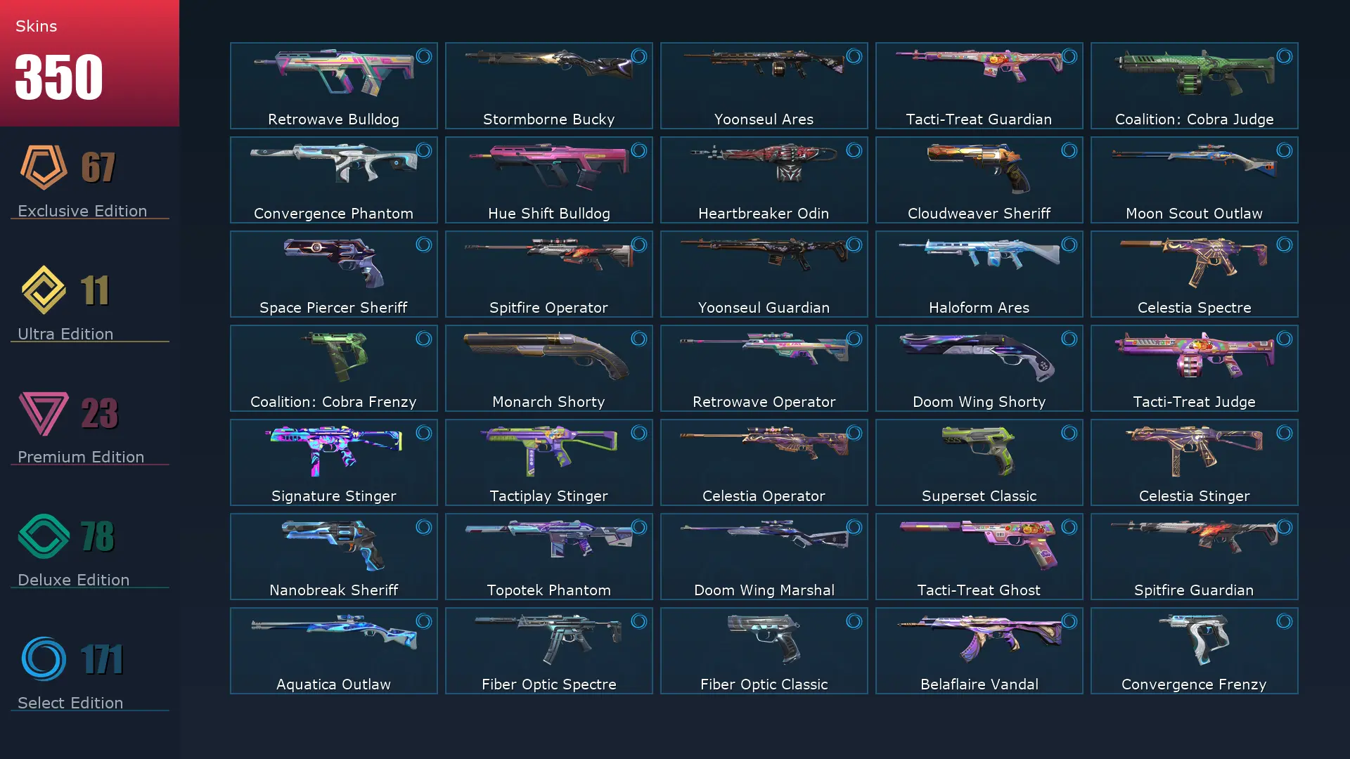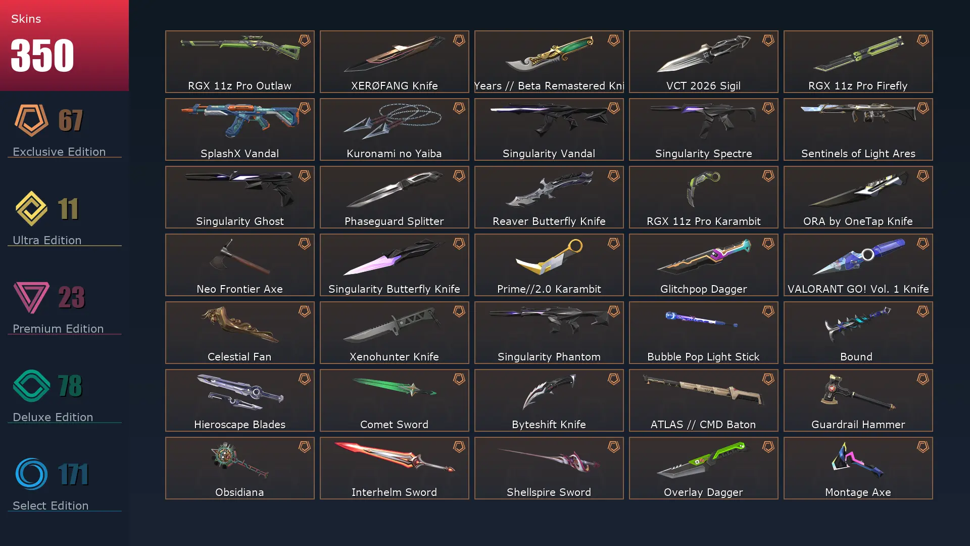 EU ⭐️ 350 Skins 🚪 Diamond 1 😯 29 Agents 🫛 500 Level 📕 Arcane Vandal 🧘 Champions 2022 Phantom 🏦 Champions 2024 Phantom 🏝 Champions 2025 Vandal 🎷 Champions 2024 Blade 🌘 Champions 2025 Butterfly Knife 😋 Arcane Gauntlets 🌒 Glitchpop Dagger