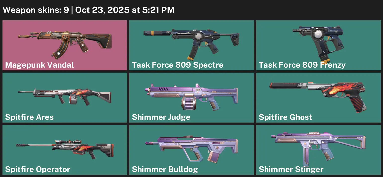 🦅 EU 🚦 Unranked 🙁 9 Skins 📹 275 VP 😒 4 Agents 🩴 Value: 1775 VP 🍵 Magepunk Vandal 🎮 Task Force 809 Spectre 🧽 Task Force 809 Frenzy 👙 Spitfire Ares 🤠 Shimmer Judge 🥅 Spitfire Ghost