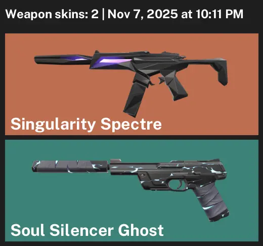🐙 NA 😧 Unranked 💨 2 Skins 📕 300 VP 💋 3 Agents 🖊 Value: 2175 VP 🧁 Singularity Spectre 🌄 Soul Silencer Ghost