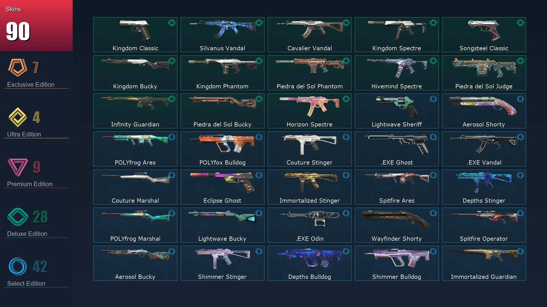 🎲 Silver 2 🧣 NA 🩴 Level 48 💻 90 Skins 🏚 Elderflame Judge ⭐️ Reaver Sheriff ⛓️💥 Elderflame Operator 😩 Oni Phantom 🗡 Oni Phantom 📠 Reaver Sheriff 🍝 Prime Guardian 🖖 Elderflame Vandal 😥 Origin Bucky 💴 Spectrum Classic 🦕 Magepunk Ghost 🏹 Reaver Sheriff