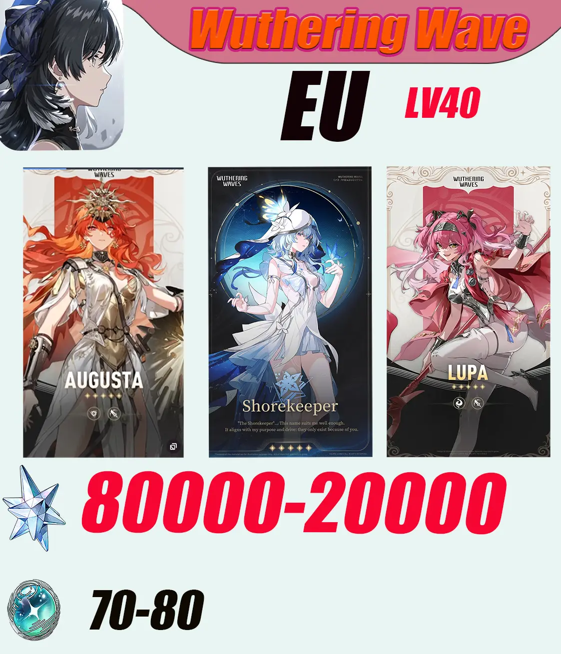 [EU]LV40|Augusta+Shorekeeper+Lupa+8000-10000 Star Voice||70-80 Summoning Vortex|Random gender|Wuthering Waves