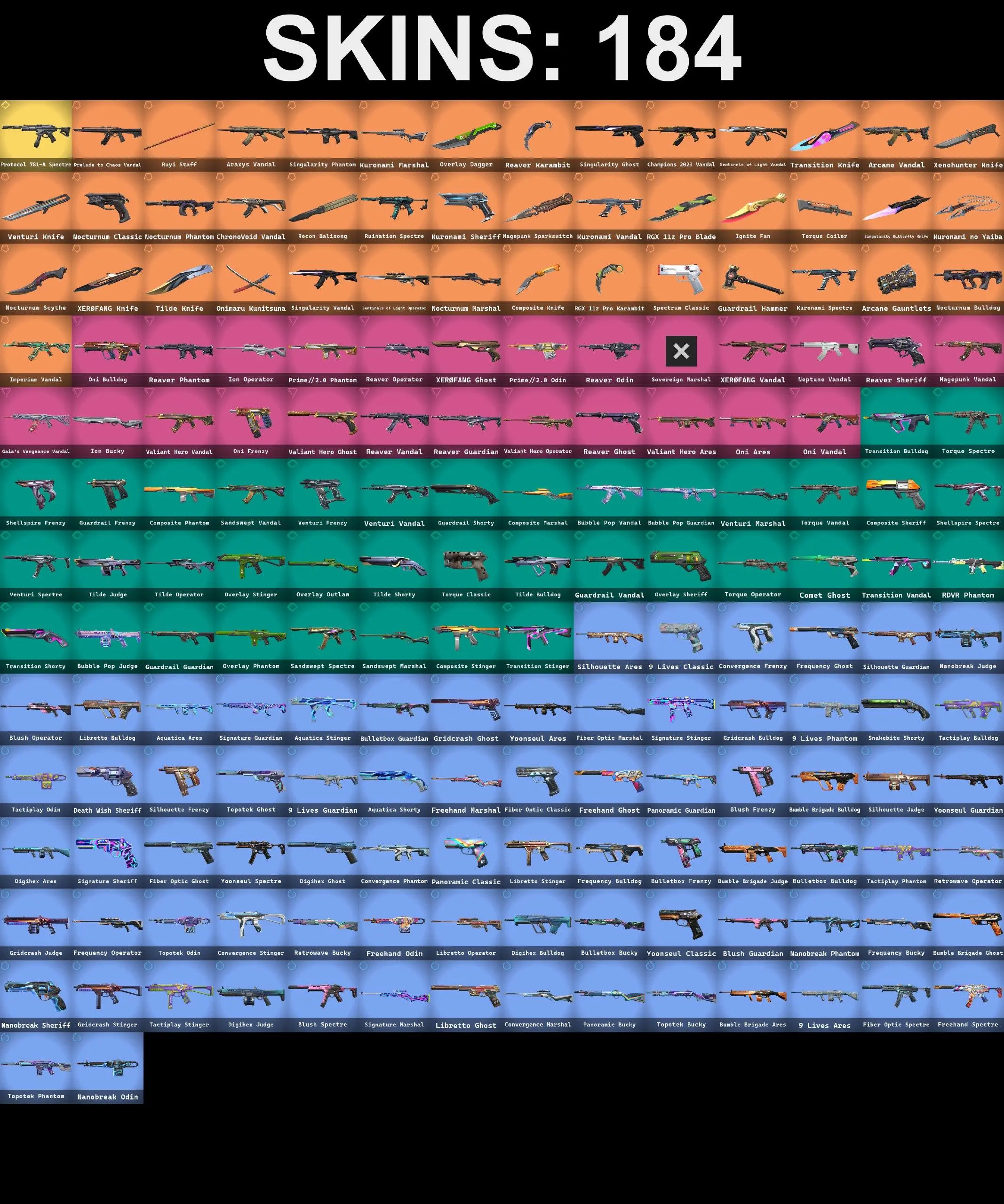 184 SKINS | 21 KNIFE | CHAMPIONS 2023 VANDAL | IGNITE FAN | KURONAMI VANDAL | KURONAMI SHERIFF | KURONAMI MARSHAL | KURONAMI SPECTRE | KURONAMI NO YAIBA | RGX 11Z PRO KARAMBIT | RGX 11Z PRO BLADE | RUINATION SPECTRE | NOCTURNUM PH