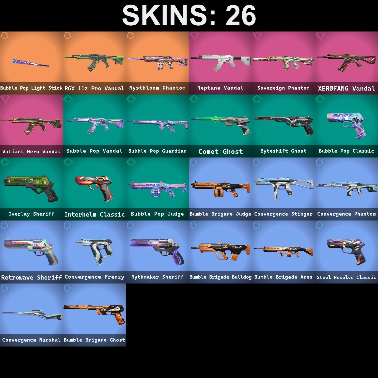 ❤️ 26 SKINS ❤️ 1 KNIFE ❤️ RGX 11Z PRO VANDAL ❤️ MYSTBLOOM PHANTOM ❤️ XERØFANG VANDAL ❤️ SOVEREIGN PHANTOM ❤️ NEPTUNE VANDAL ❤️ VALIANT HERO VANDAL ❤️ COMET GHOST ❤️ BUBBLE POP LIGHT STICK ❤️ BUBBLE POP VANDAL ❤️