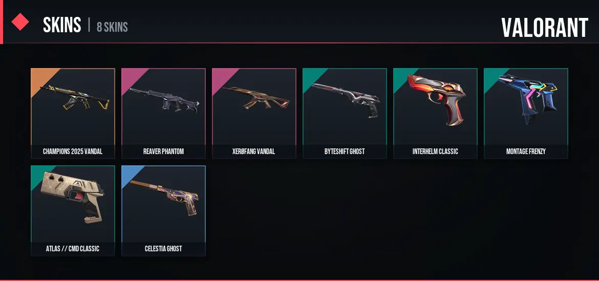 8 Skins / 6225 VP SPENT / Champions 2025 Bundle / Champions 2025 Vandal / Reaver Phantom