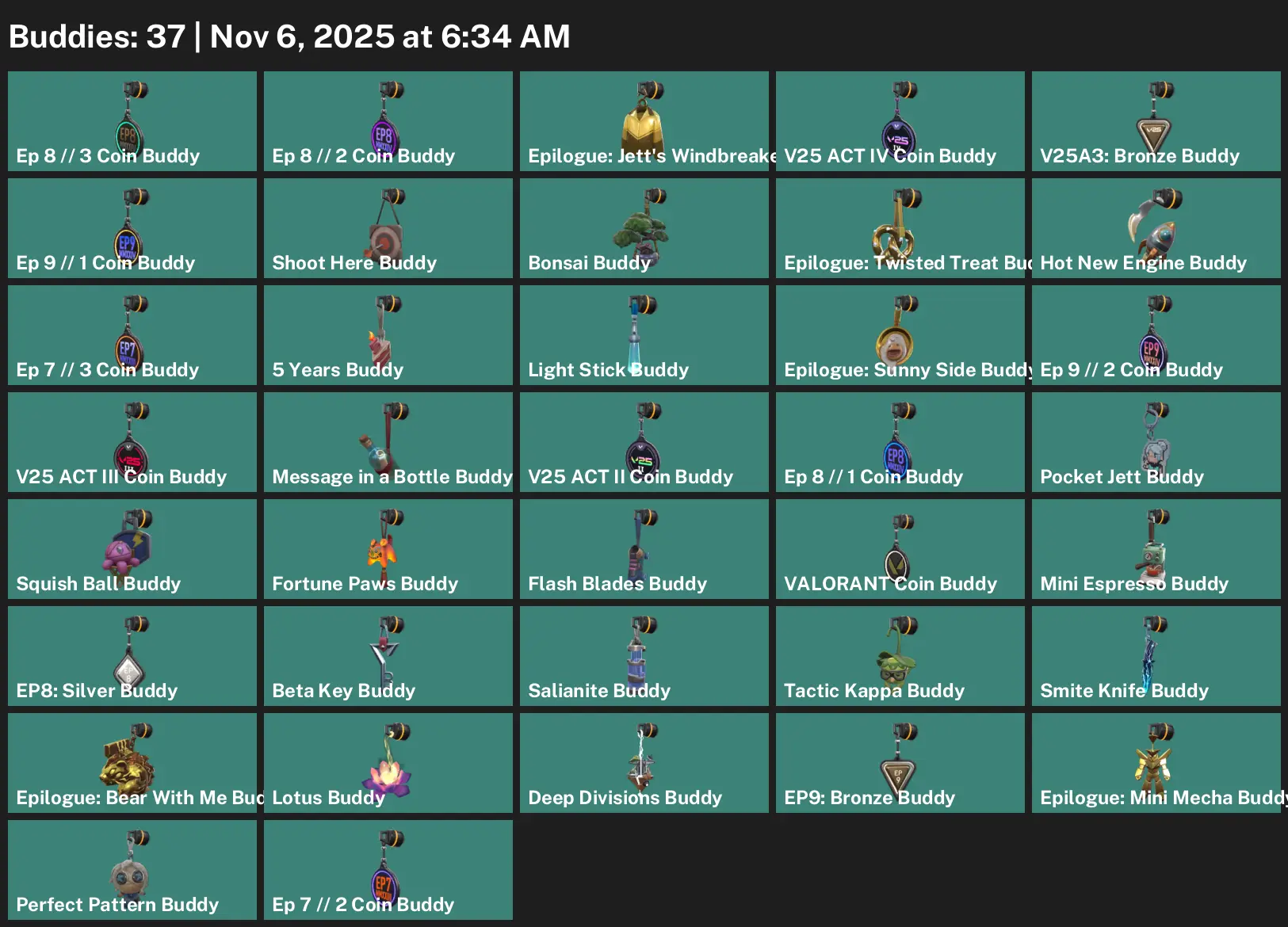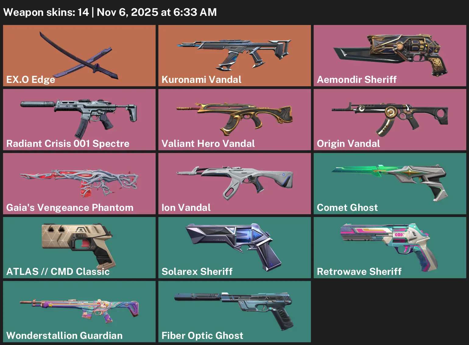 🤽♂️ AP 🛬 Unranked 🥦 14 Skins 🛕 10 VP 🐰 22 Agents 🤩 Value: 19250 VP 🍱 EX.O Edge 🏎 Kuronami Vandal 🪚 Aemondir Sheriff 🧇 Radiant Crisis 001 Spectre 🦁 Valiant Hero Vandal 💡 Origin Vandal