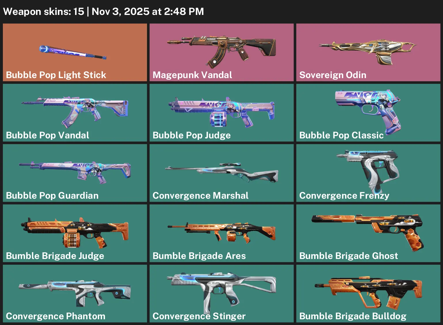 🍠 AP 🚧 Unranked 🦟 15 Skins 🩰 225 VP 📓 8 Agents 🫛 Value: 3550 VP 🥬 Bubble Pop Light Stick ⚱️ Magepunk Vandal 🧄 Sovereign Odin 🏐 Bubble Pop Vandal 🕯 Bubble Pop Judge 🚓 Bubble Pop Classic