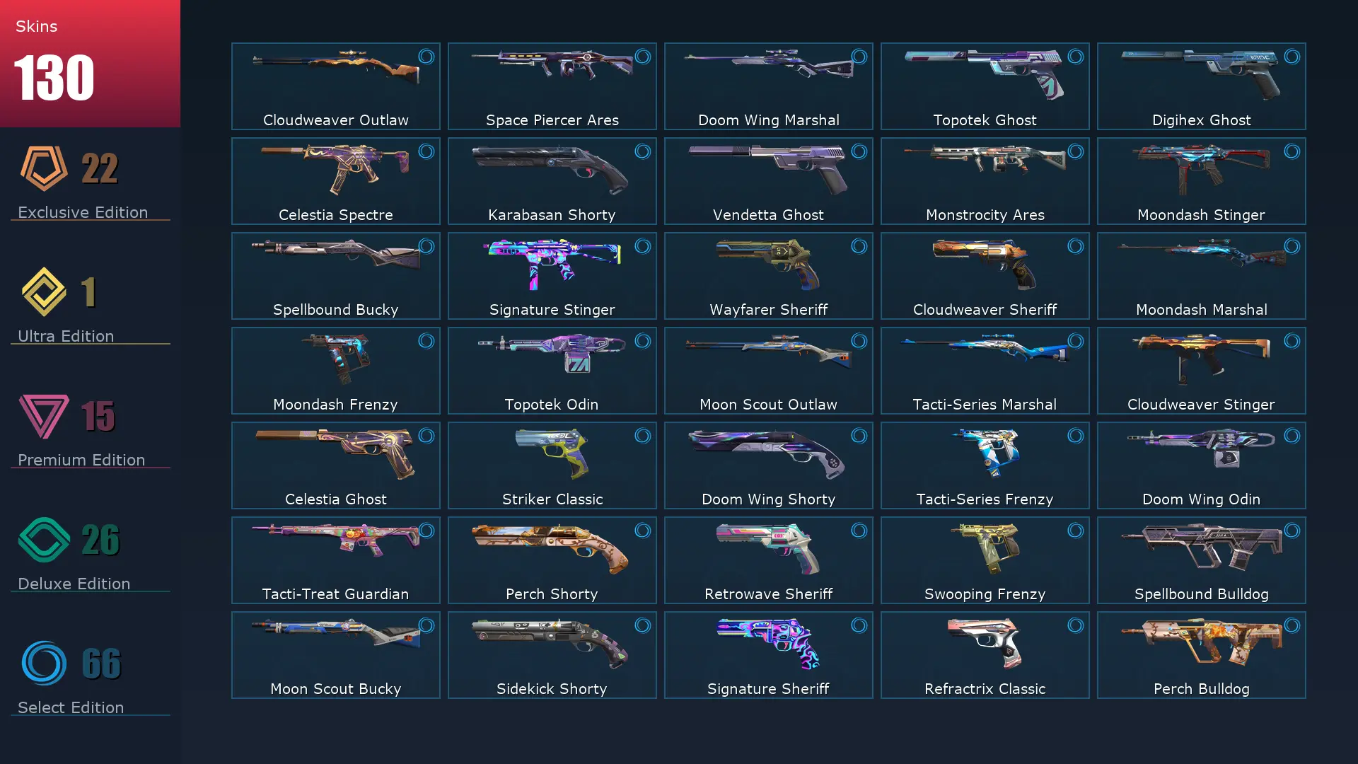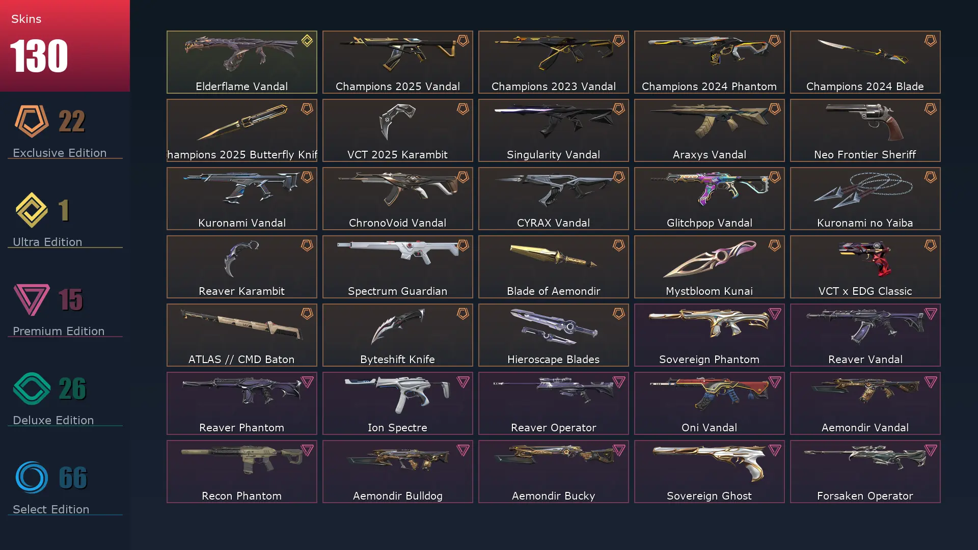 EU 🐂 130 Skins 🧭 28 Agents 🦄 335 Level 👐 Champions 2025 Vandal 🦽 Champions 2023 Vandal 🎎 Champions 2024 Phantom 🤾♀️ Champions 2024 Blade 🔦 Champions 2025 Butterfly Knife ⌛️ VCT 2025 Karambit ✏️ Sovereign Ghost 🥾 Singularity Vandal