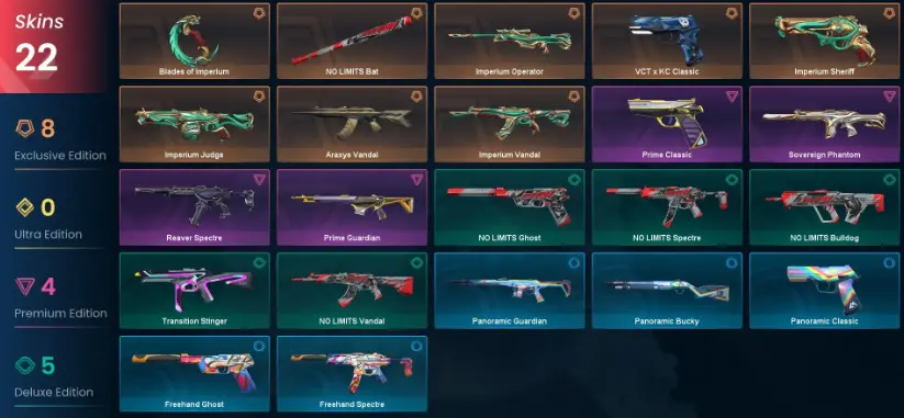 EU / 22 skins / Imperium Bundle / Araxys Vandal / Sovereign Phantom / VCT x KC Classic / Prime Guardian / V17