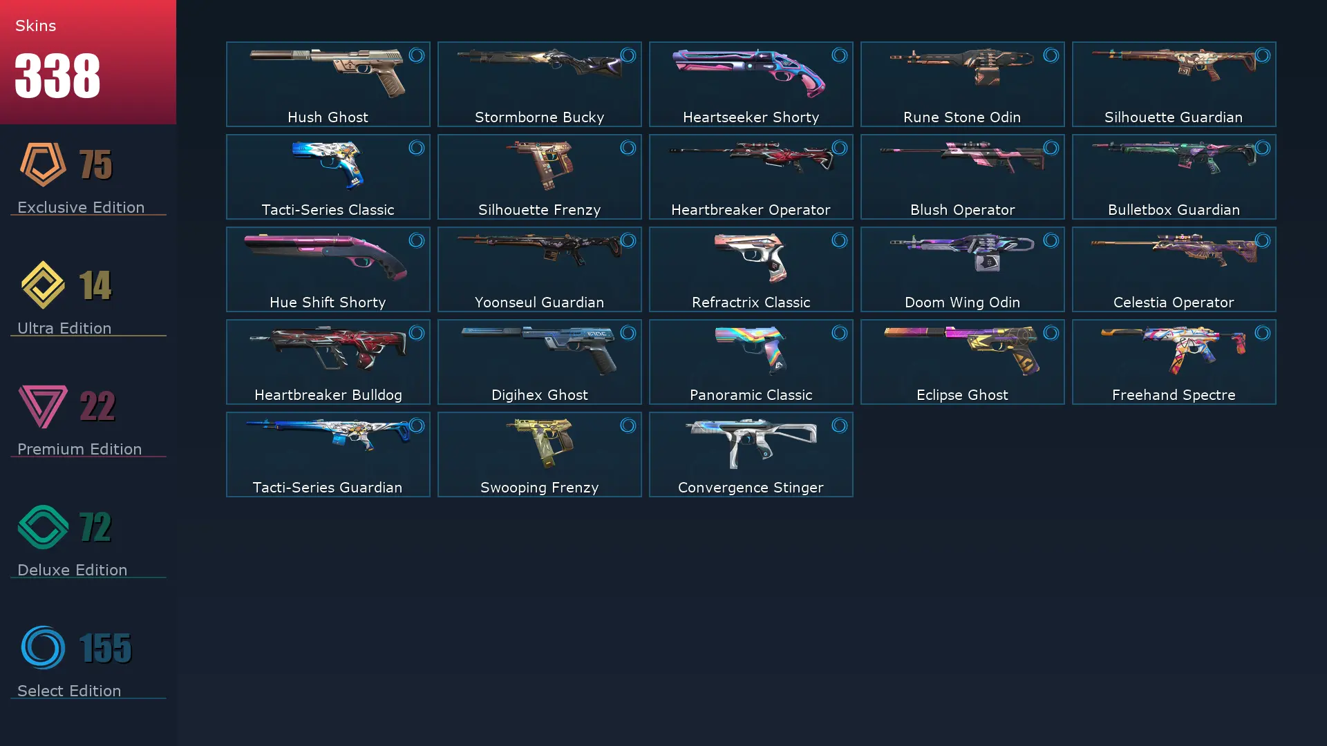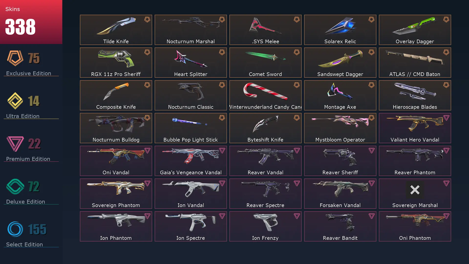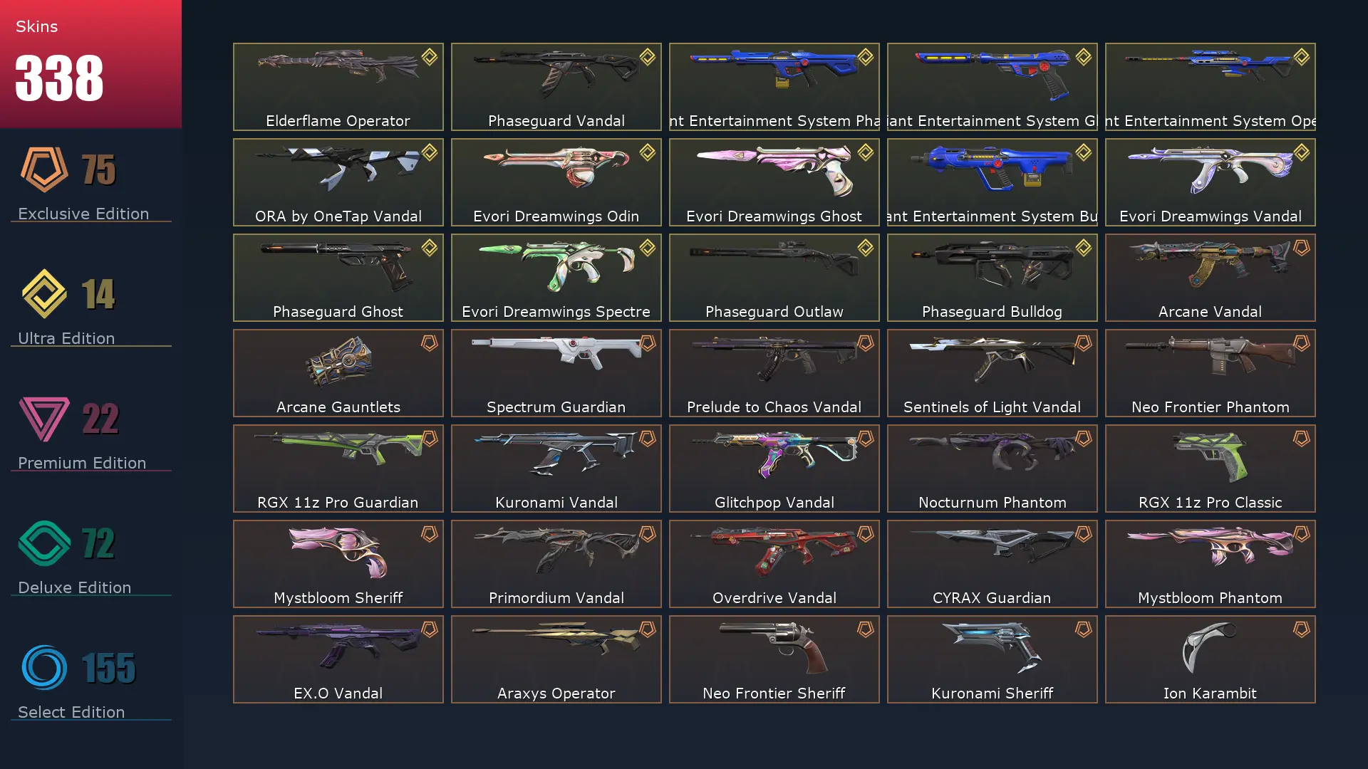 EU 💒 338 Skins 🐋 Diamond 3 💣 29 Agents 🛥 500 Level 😹 Arcane Vandal 🐨 Arcane Gauntlets 🐈 Sovereign Phantom 🪷 Evori Dreamwings Ghost 🚠 XERØFANG Knife 😷 Equilibrium 💶 Radiant Entertainment System Operator 🌒 RGX 11z Pro Classic
