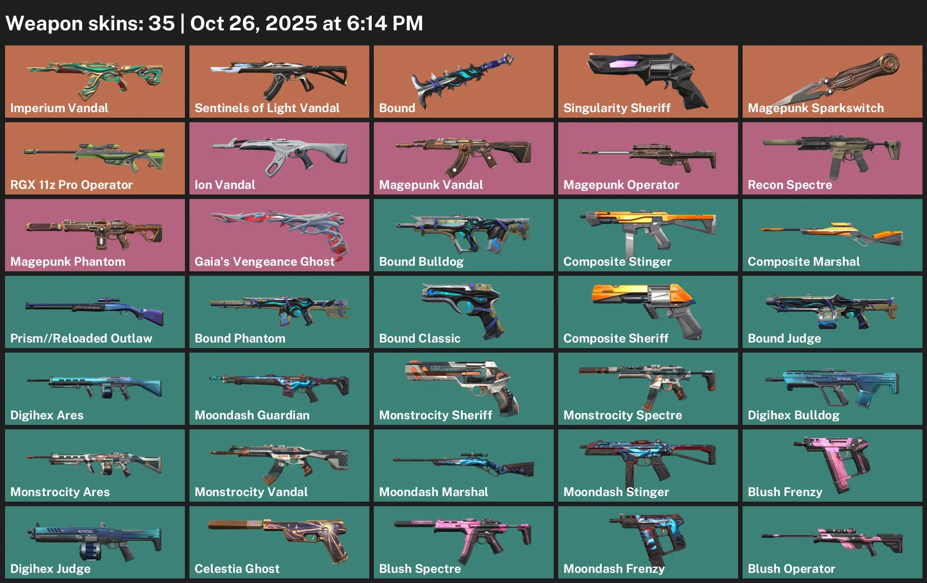 🍦 EU 🪡 Gold 1 😊 35 Skins 🔏 170 VP 😵💫 18 Agents 🍨 Value: 24975 VP ⚾️ Imperium Vandal 🐳 Sentinels of Light Vandal 🗾 Bound 📑 Singularity Sheriff 🚁 Magepunk Sparkswitch 🐌 RGX 11z Pro Operator