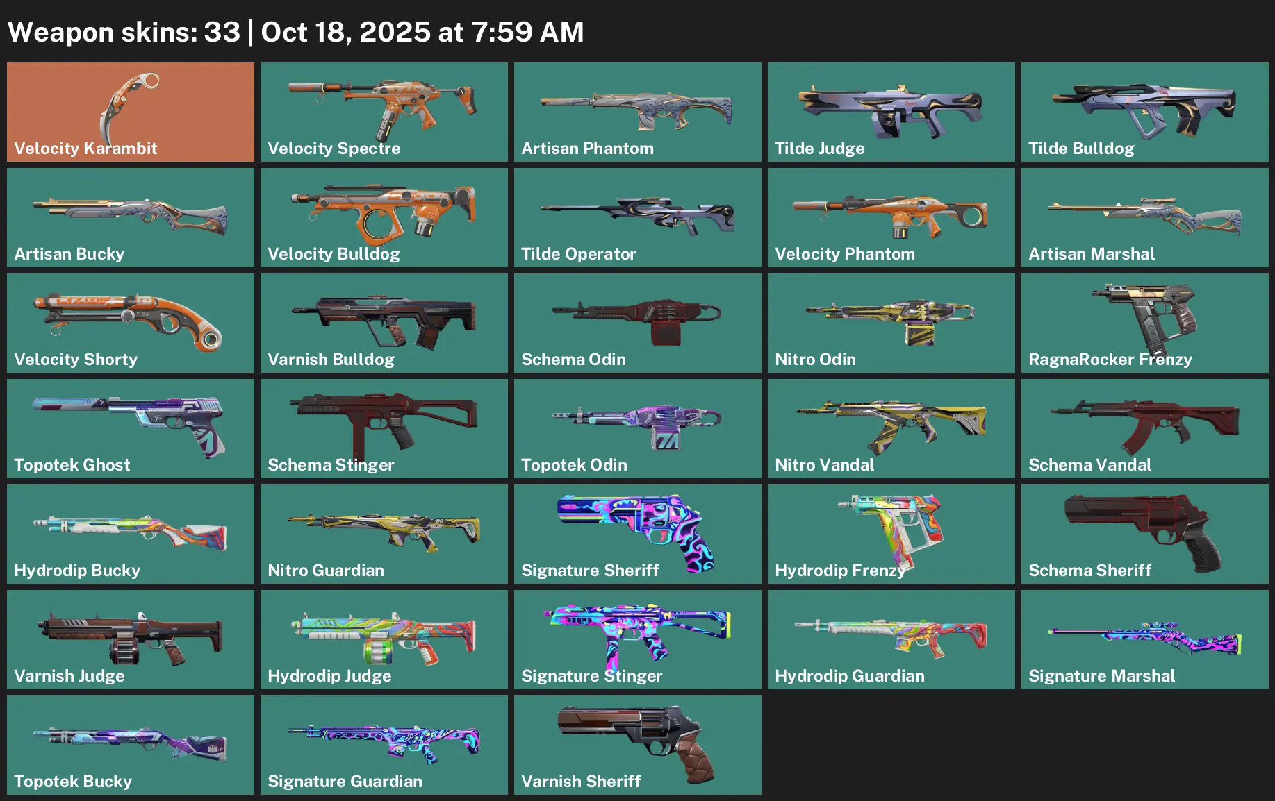 EU | Unranked | 33 Skins | 1 Knife | Velocity Karambit | Velocity Spectre | Artisan Phantom | Tilde Judge | Tilde Bulldog | Artisan Bucky | Velocity Bulldog | Tilde Operator | Velocity Phantom