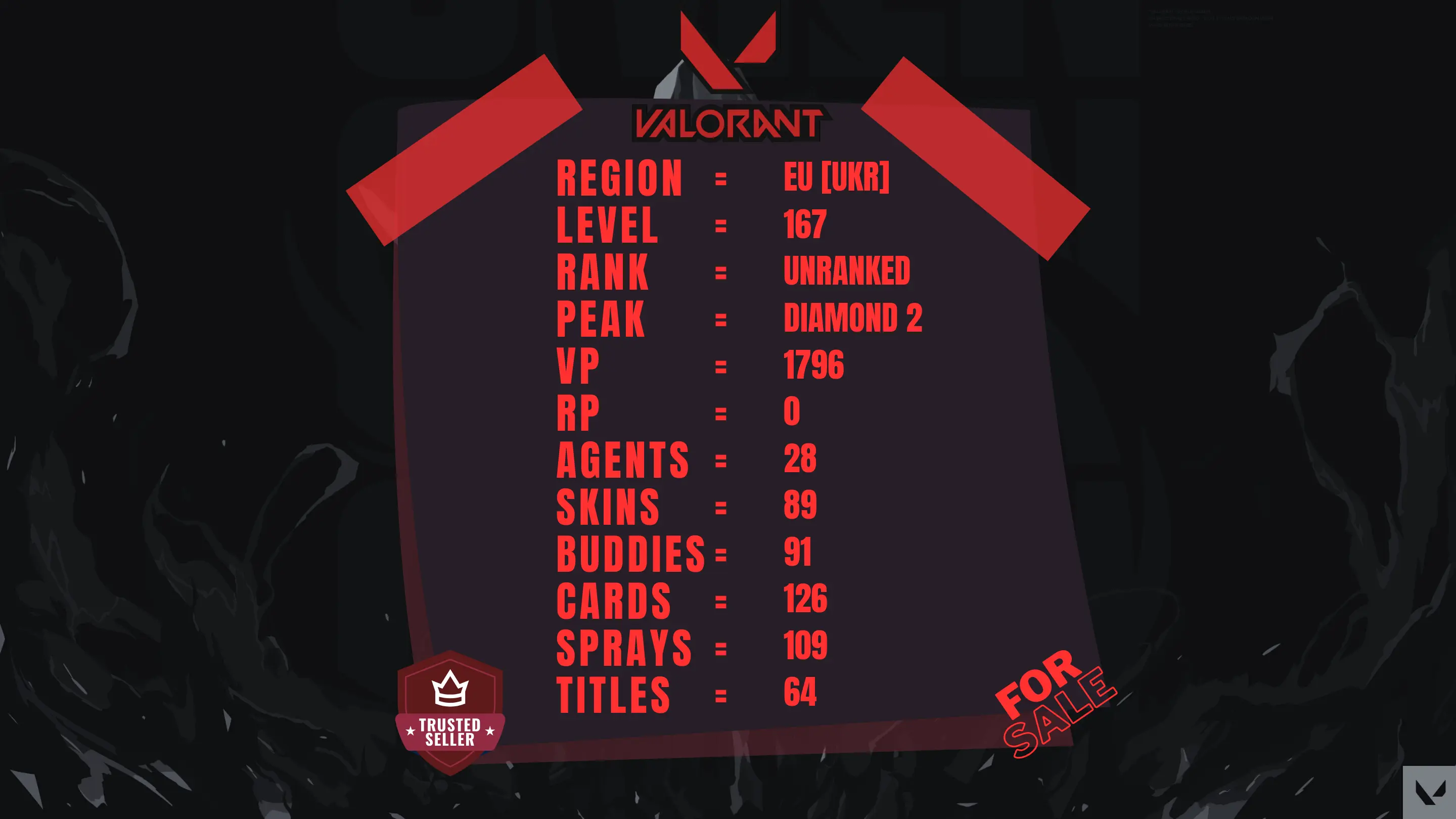 EU ⸱ RARE -🎖️ Diamond 2 ⸱ 🔢 167 Level ⸱ ⬆️ Peak Diamond 2 ⸱ 🔫 89 Skins ⸱ 🎟️ 4x Battlepass ⸱ 💰 1796 VP ⸱ 🧬 28x Agents ⸱ 📝 Check Description