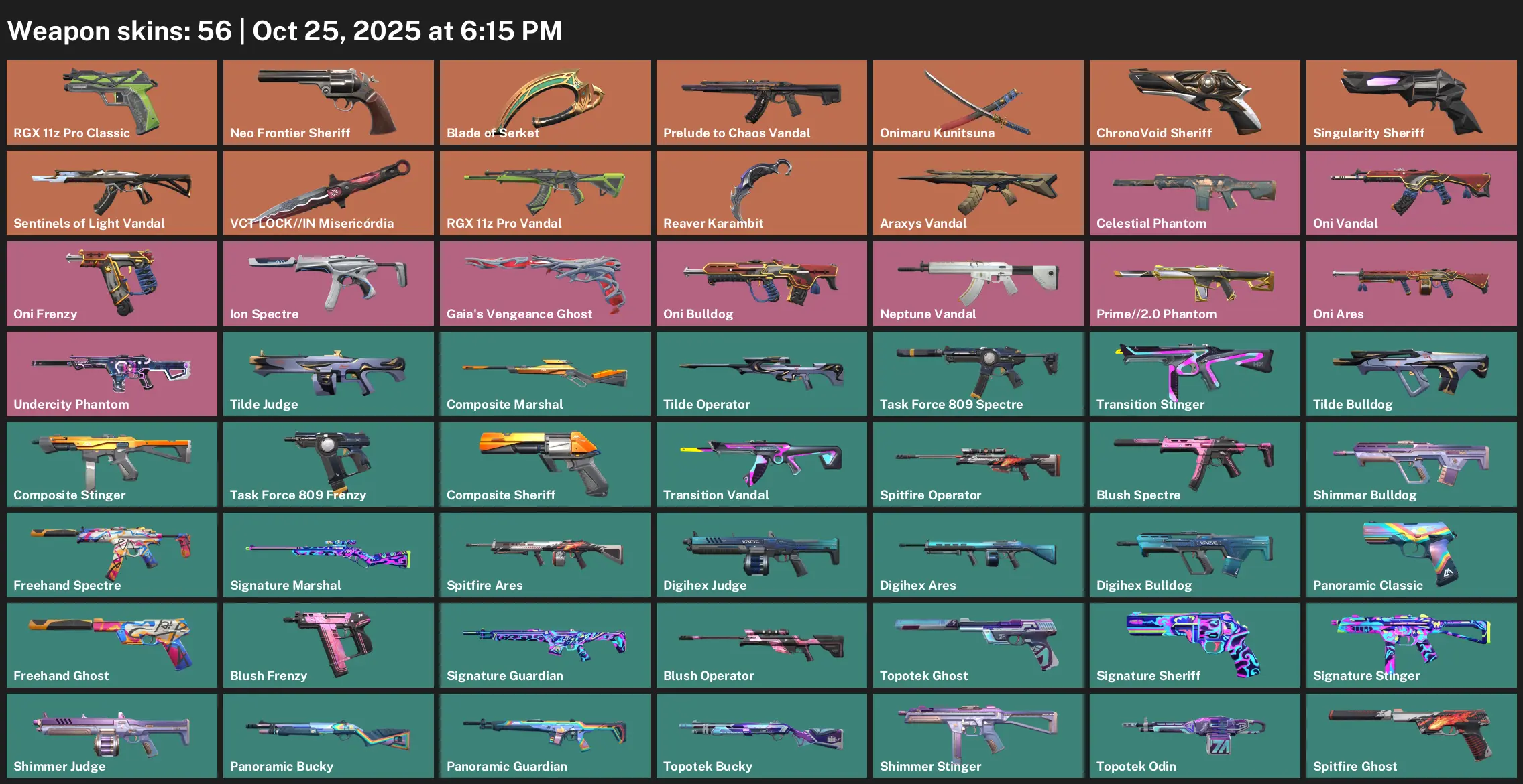 ๐ซ LA ๐ฎ Unranked ๐ฆ 56 Skins ๐ผ 635 VP ๐ค 23 Agents ๐ซณ Value: 52840 VP ๐ RGX 11z Pro Classic ๐ Neo Frontier Sheriff ๐๏ธ Blade of Serket ๐ชผ Prelude to Chaos Vandal ๐ Onimaru Kunitsuna ๐ฃ ChronoVoid Sheriff
