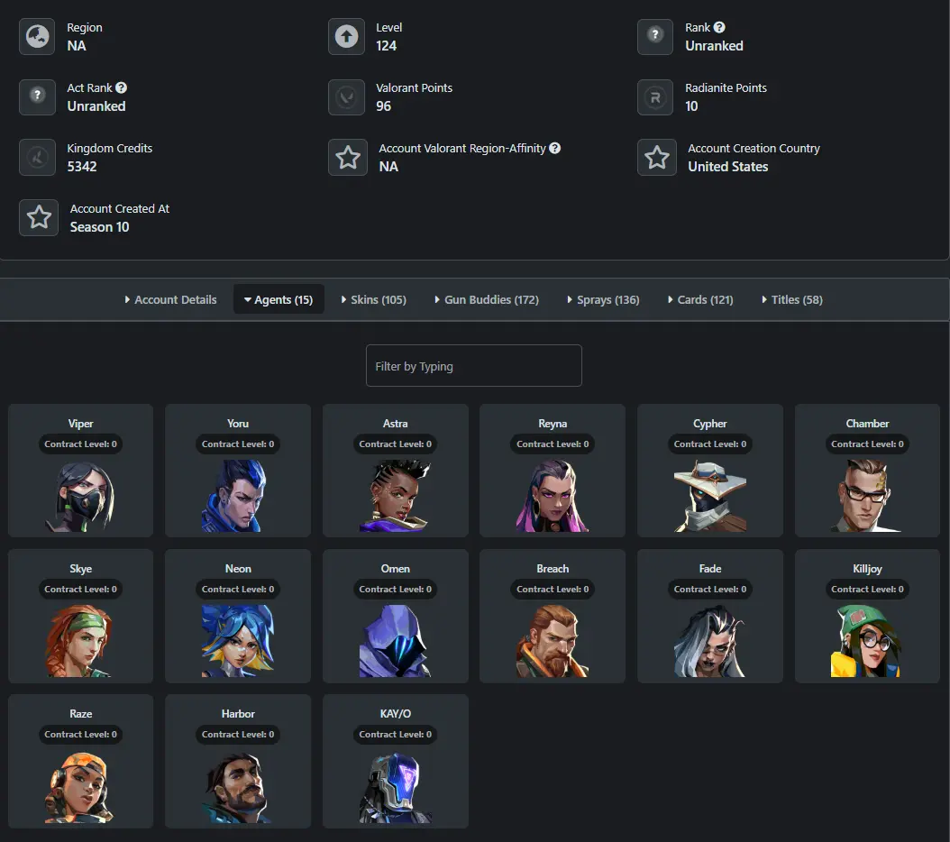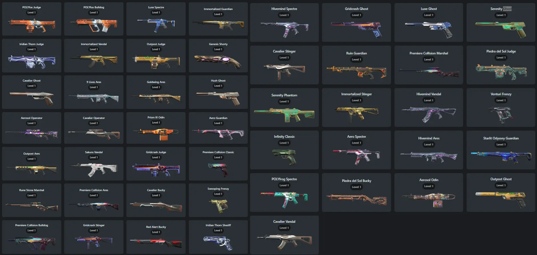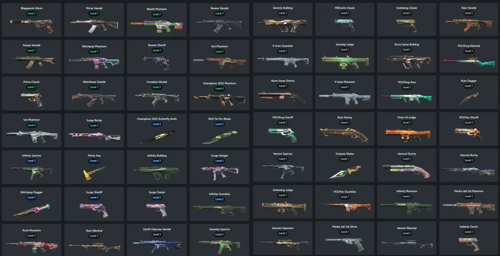 NA / 105 Skins / Reaver Vandal / Champions 2022 Phantom / Champions 2022 Butterfly Knife / RGX 11z Pro Blade / Elderflame Vandal / V97