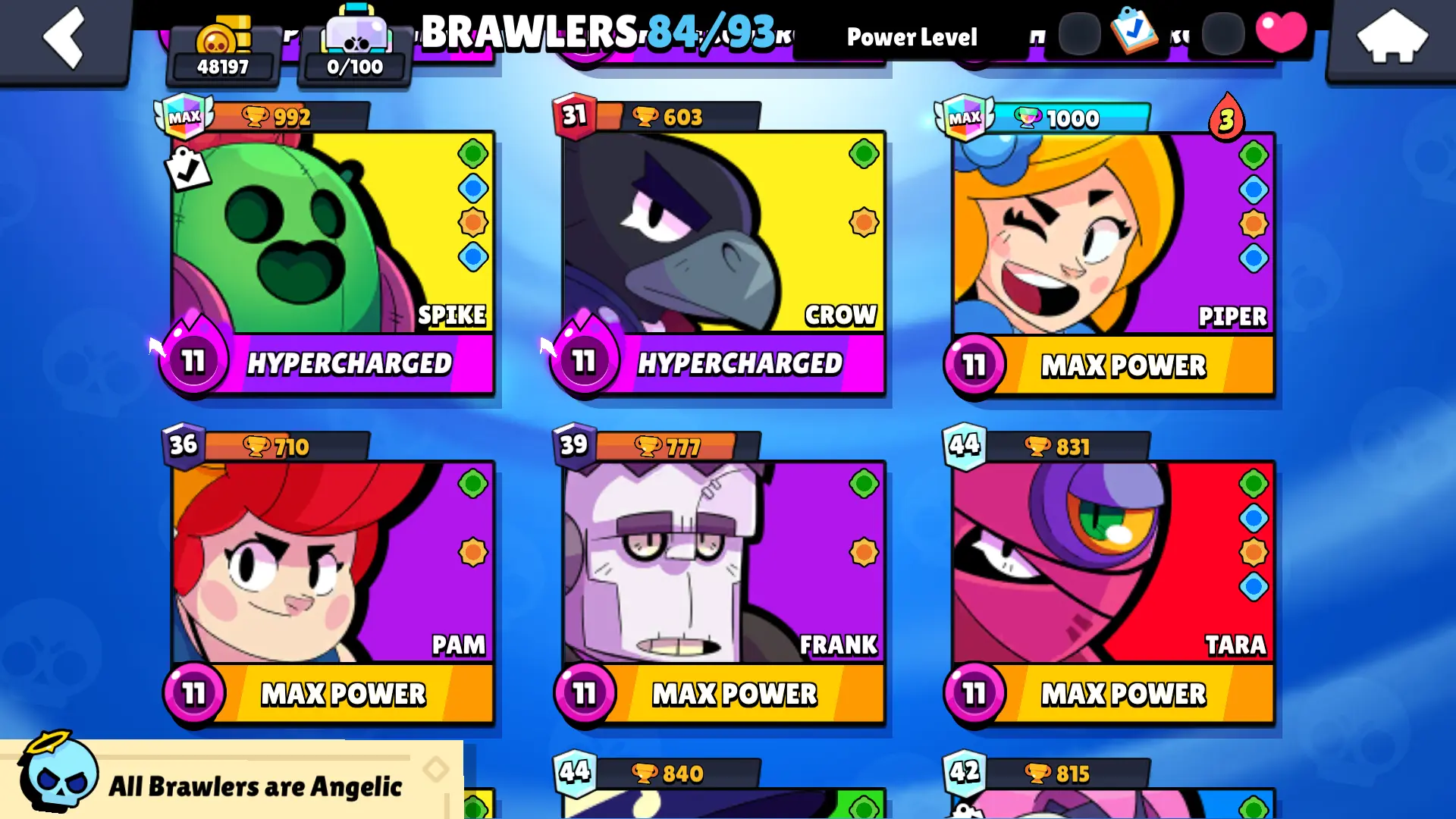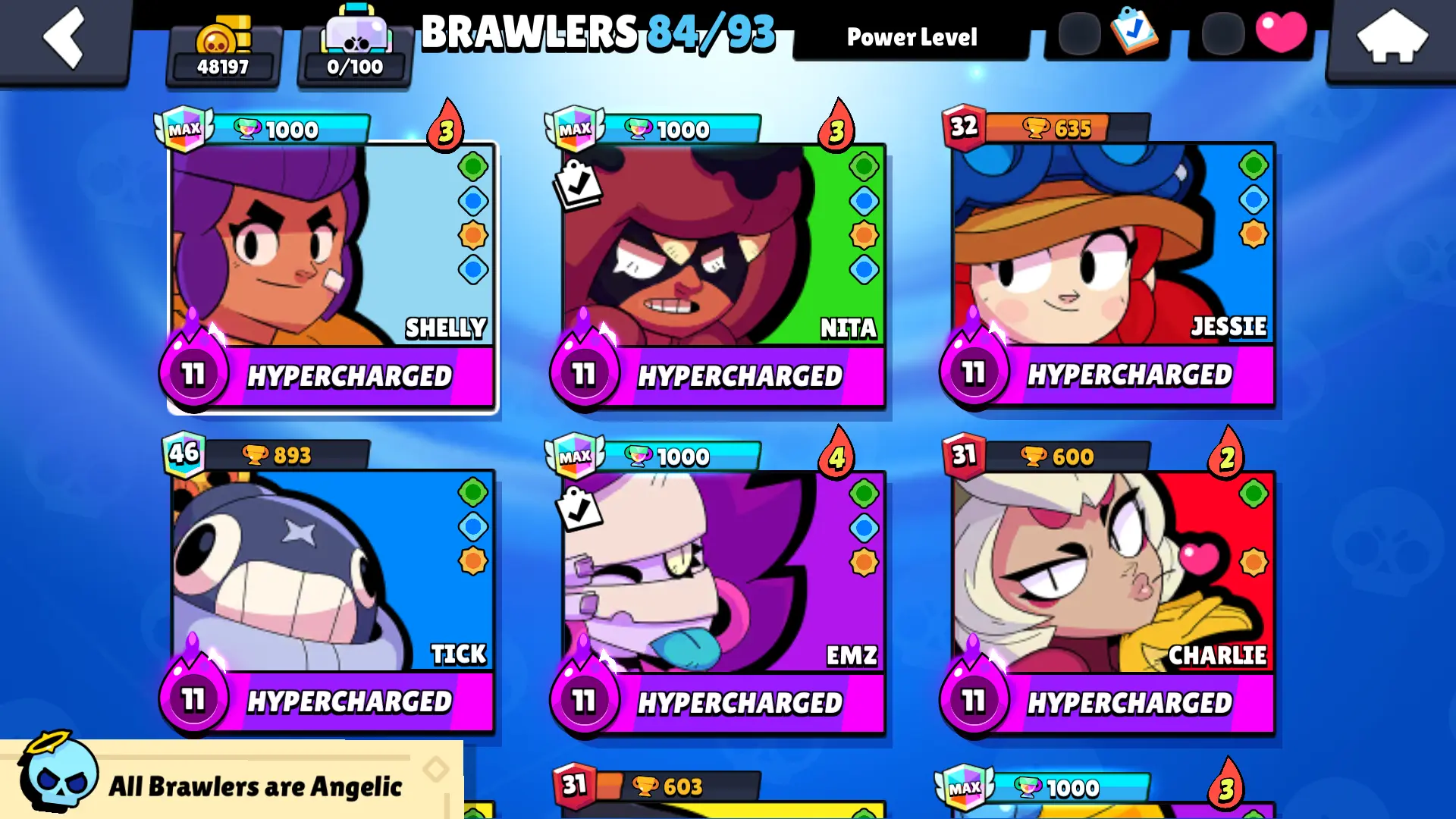 128 SKINS | 48197 TROPHIES | GODZILLA BUZZ | VIRUS CHARLIE | TOON SPIKE | SURGE LIGHTYEAR | SPONGEBOB EL PRIMO | WARRIOR BO | UNDERWORLD BO | DRAGOON BELLE | LUNAR PIPER | CUPID PIPER | DJ 3.M.Z | SHELL BLASTER GALE | GALAXY STORM LOLA | 84 BRAWLERS