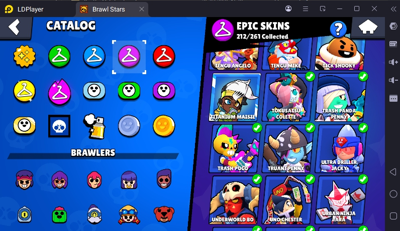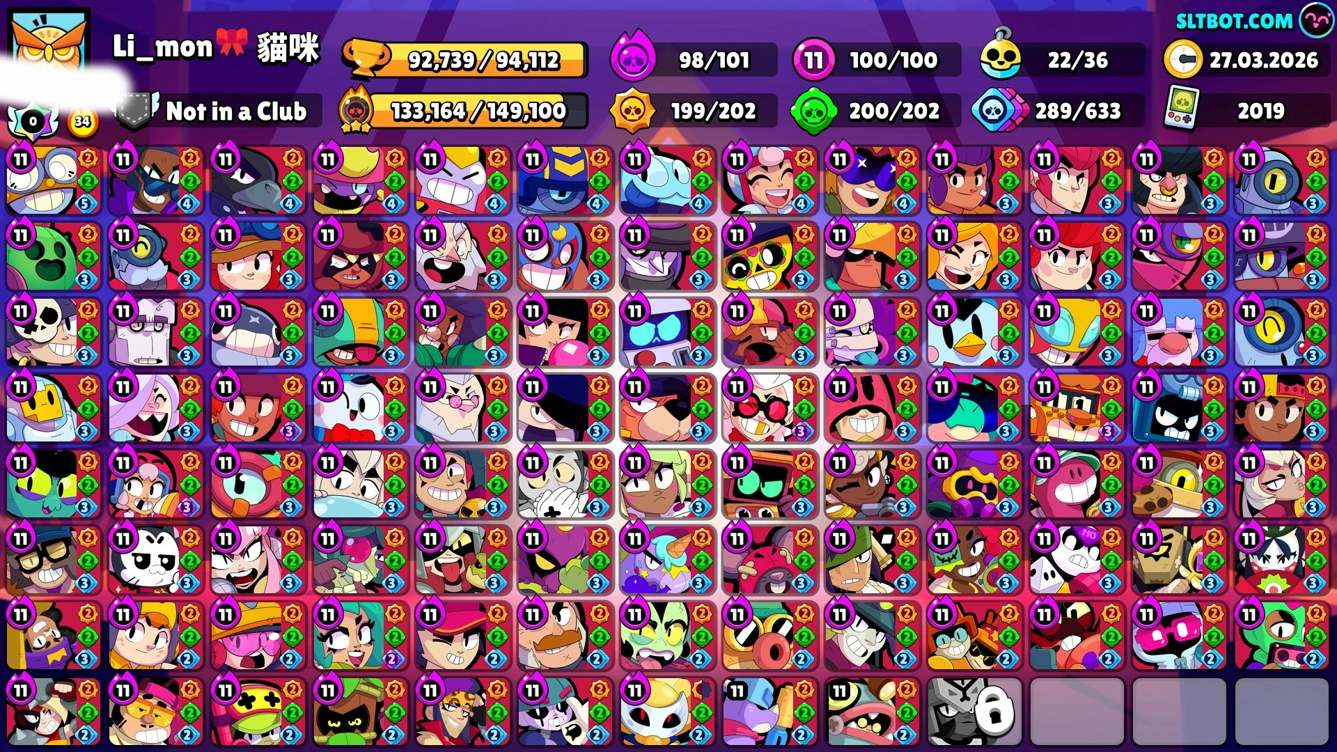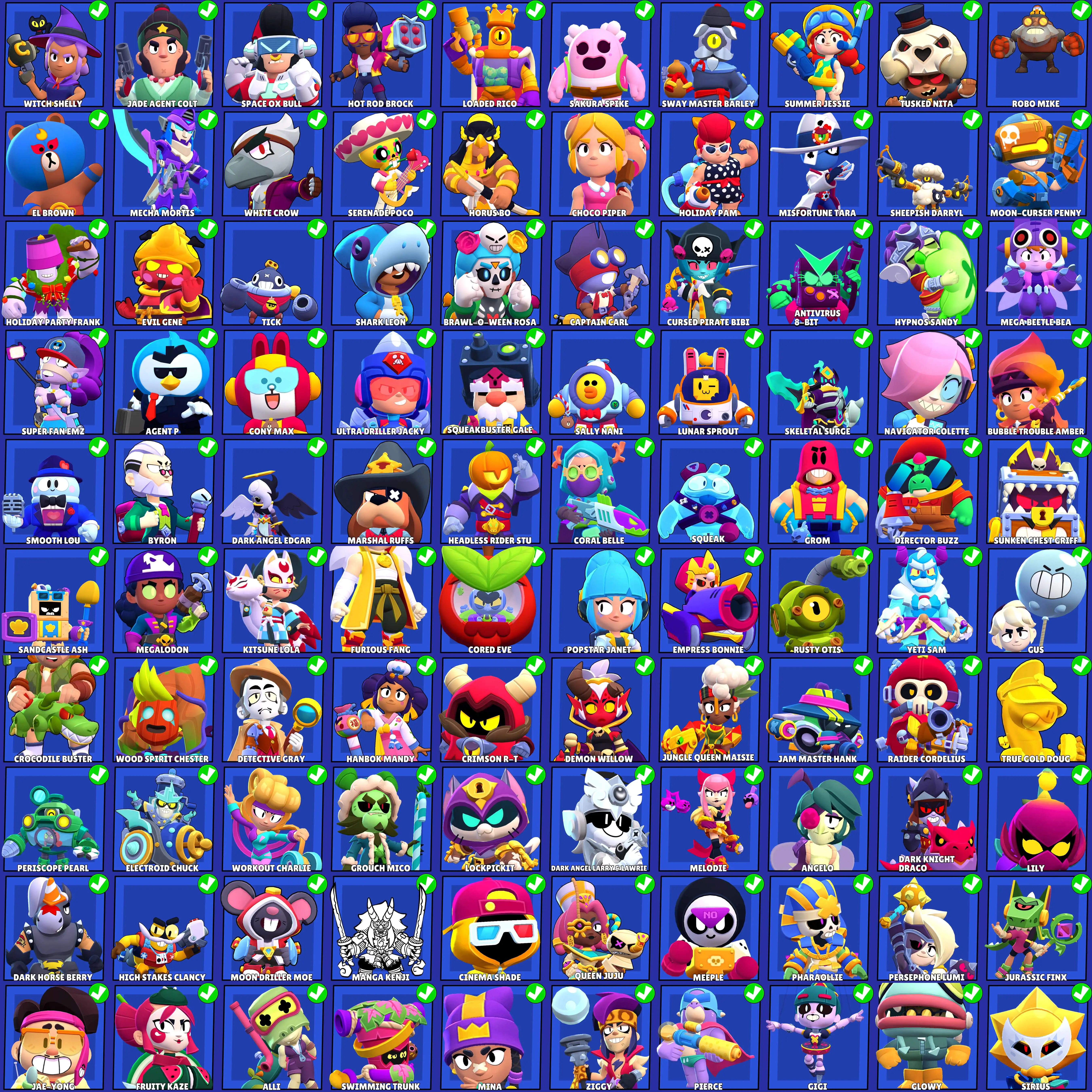 212 EPIC SKINS 💜 477 SKINS 💯 76K POWER POINTS 💜 183206 COINS 💜 X3 MASTERS 2024 💜 92.739 TROPHIES 🏆 100 BRAWLERS 🐼 98 HYPERCHARGED 🩸 69 PRESTIGE 💜 100 MAX BRAWLERS 💛 22 BUFFIES 🔑 FURIOUS FANG 🧡 NINJA ASH 🧡 REBEL LOLA 🧡 WITCH SHELLY 💯 80K 90K