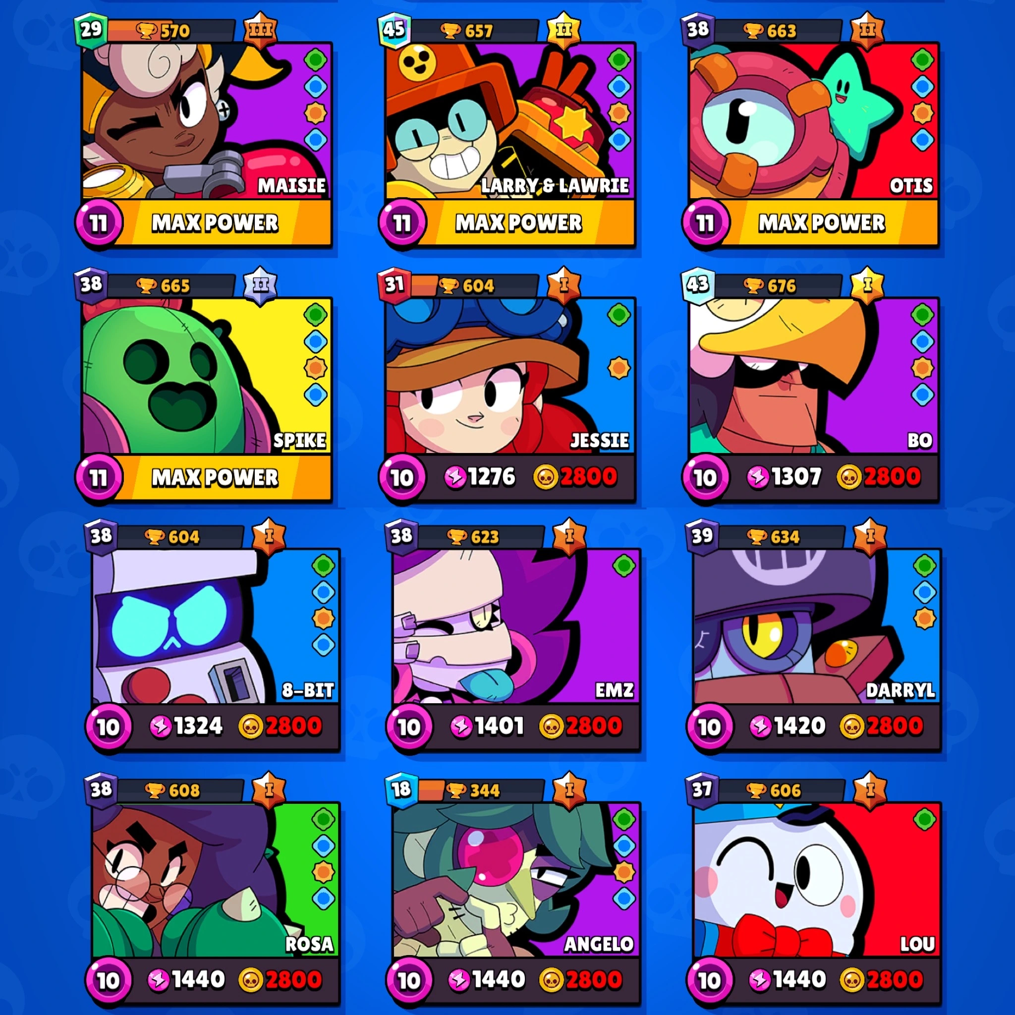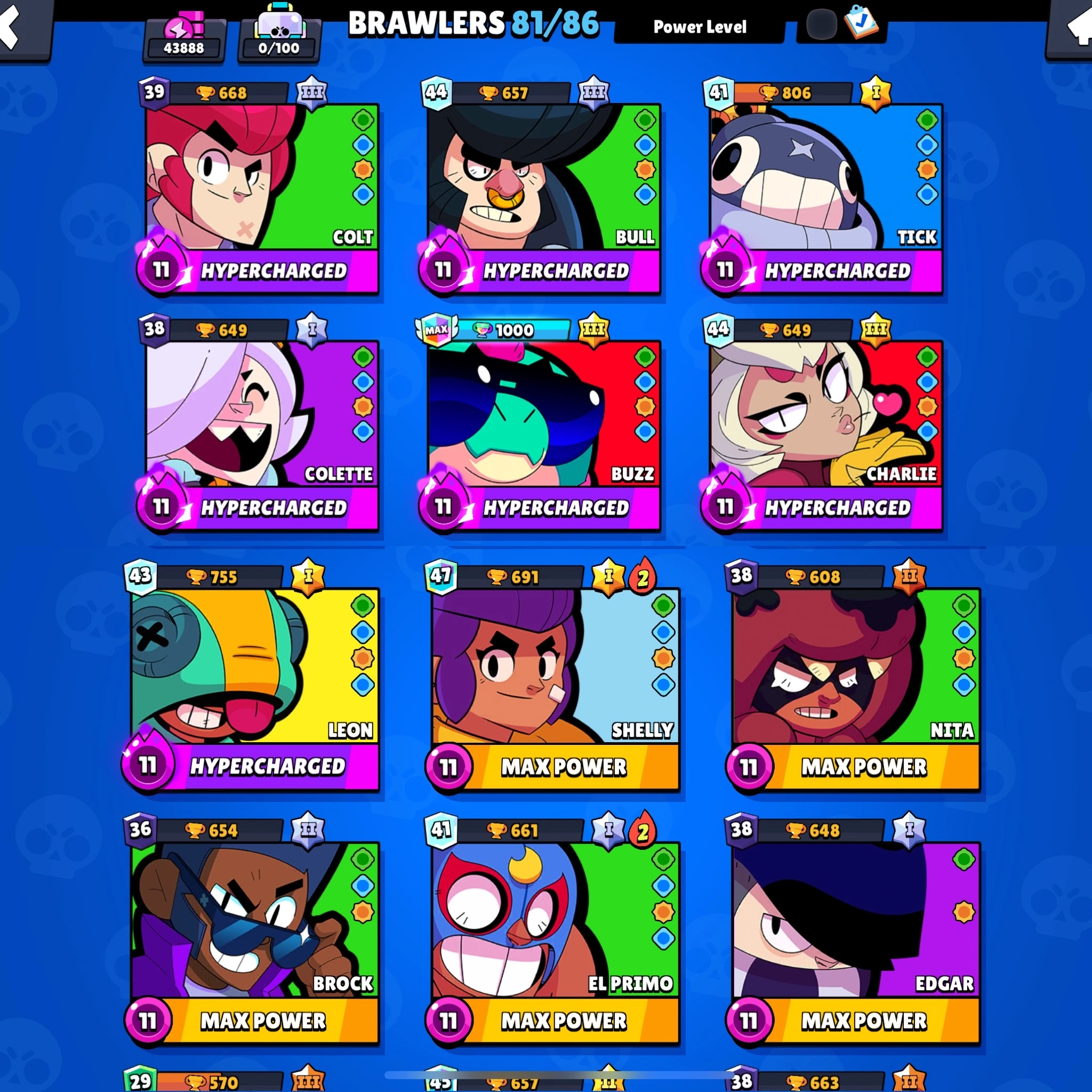 43.8k Trophy ✅ Rare Leo Skin Hypercharged ⸱ Colt , Bull , tick , Colette , Buzz , Charlie , Leon ✅ Max ⸱ Shelly , Nita , Brock , El primo ,Edgar , Maisie , Larry & Lawrie , Otis , Spike #B361