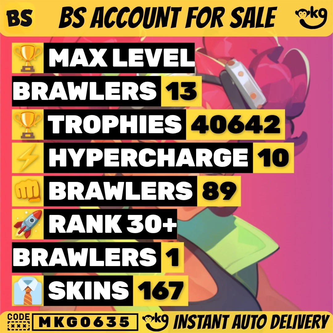 167 SKINS 💯 WHITE WOLF LEON 🧡 40.642 TROPHIES 🏆 89 BRAWLERS 🐼 10 HYPERCHARGED 🩸 13 MAX BRAWLERS 💛 RONIN RUFFS !MKG0635
