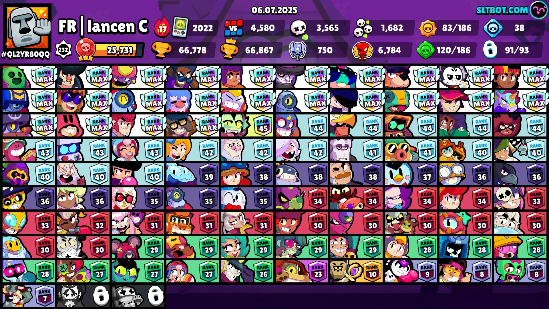 PRO PASS ⭐ 9 TITLES ⭐ 10 LEGENDARY SKINS ⭐ 227 SKINS ⭐ 66.800 TROPHY ⭐ 91 BRAWLERS ⭐ 36 MAX ⭐ 31 HYPERCHARGED ⭐ MECHA MORTIS ⭐ VALKYRIE JANET ⭐ CURSED KENJI ⭐ SCARLET PALADIN SURGE ⭐ BLUE PITCHER FANG ⭐ SPIKE ⭐ LEGENDARY ⭐ LEON