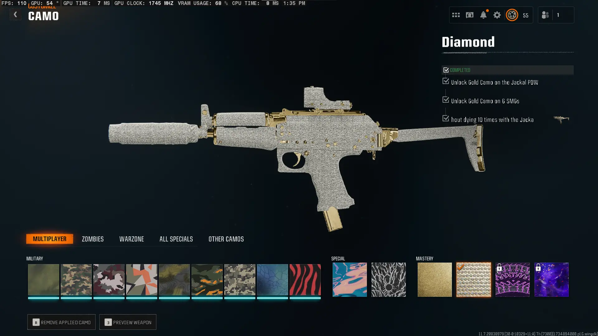 💎 ⦿ 13 Diamond Camos ⦿ Game Pass Activated ⦿ BO6 / Warzone ⦿ Level 55 ⦿ 13 Gold Camos ⦿ 170 Total Camos ⦿ Ready To Enter Prestige ⦿ 16 Operators ⦿ Linkable To Any Platform 💎