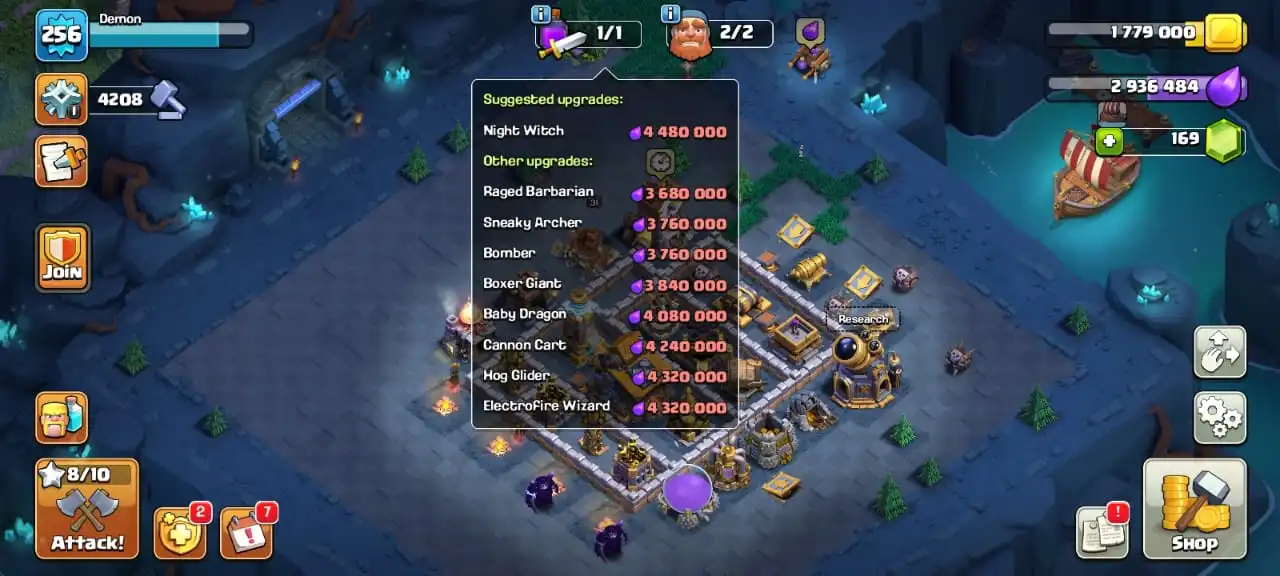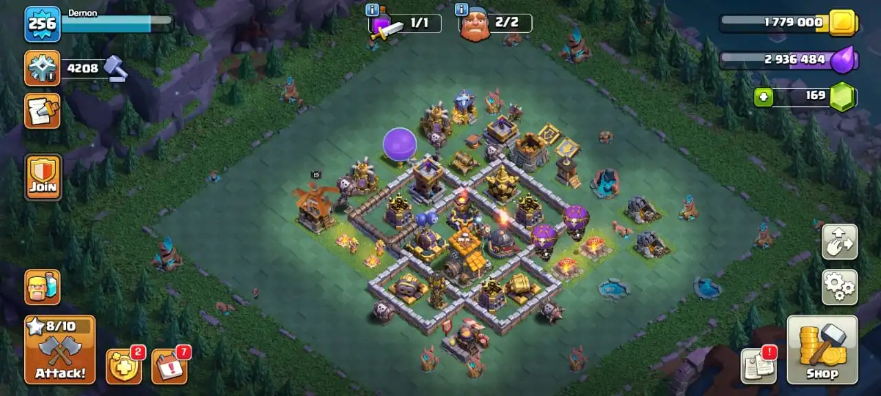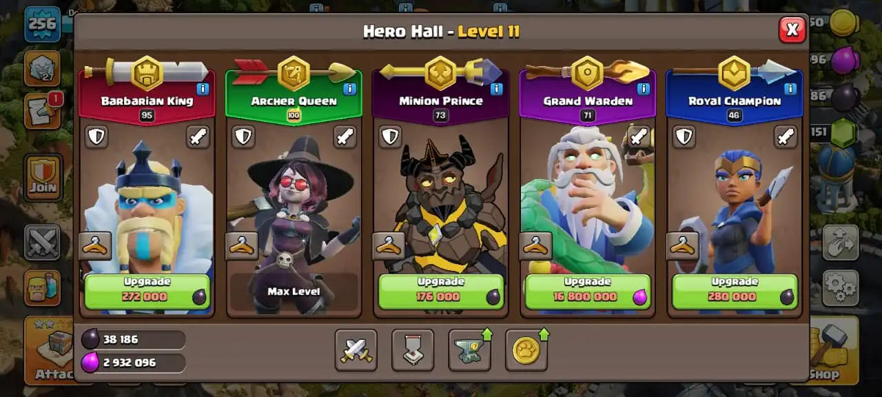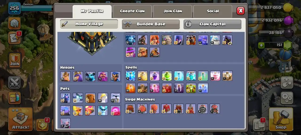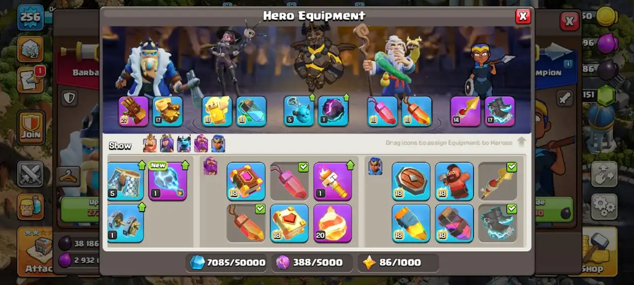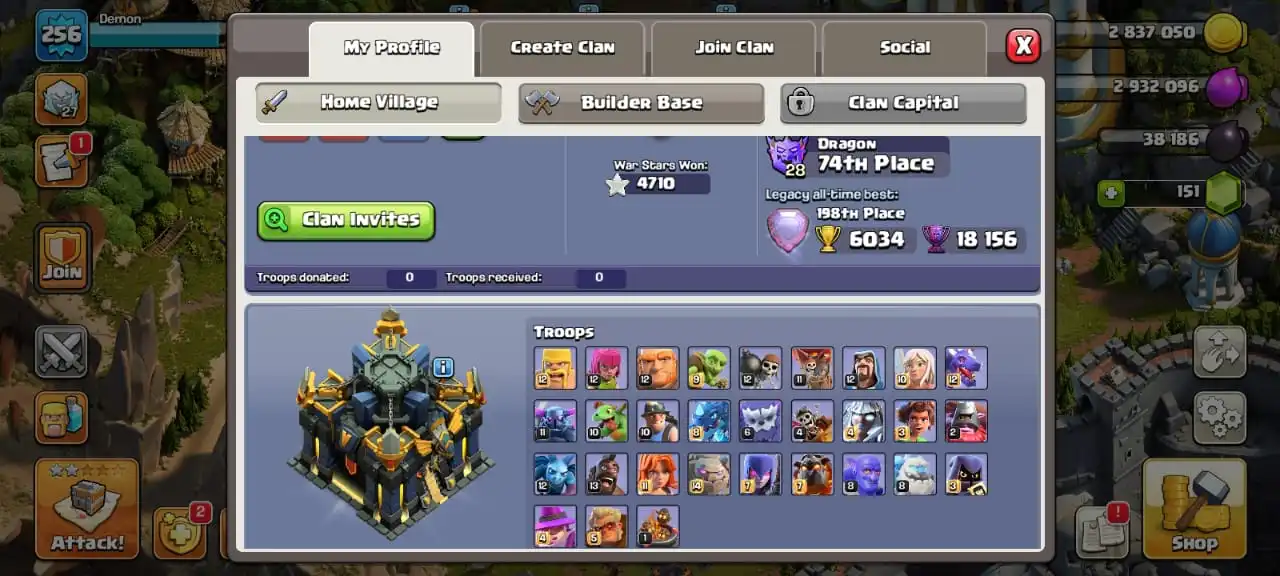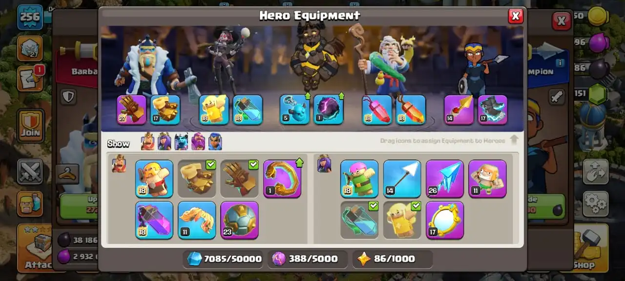 Clash of dragons scenery✅TH 17 almost max🔥high heroes level 95/100/73/71/46🔥max pets☠️11 epic equipment⚒️6 builder’s⚒️all helper opened✅15 heroes skin