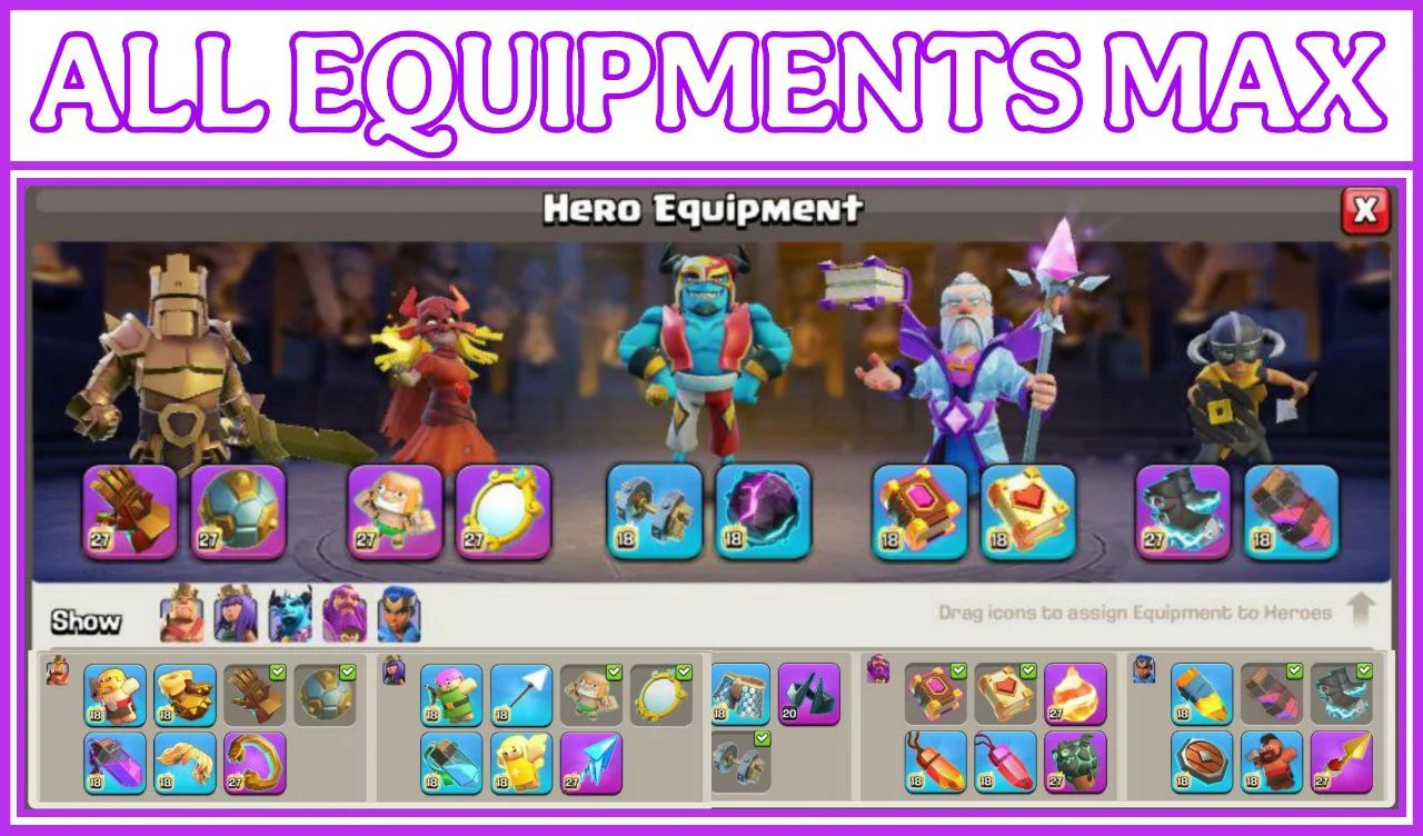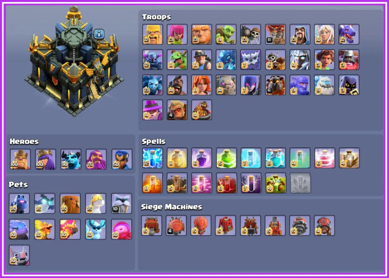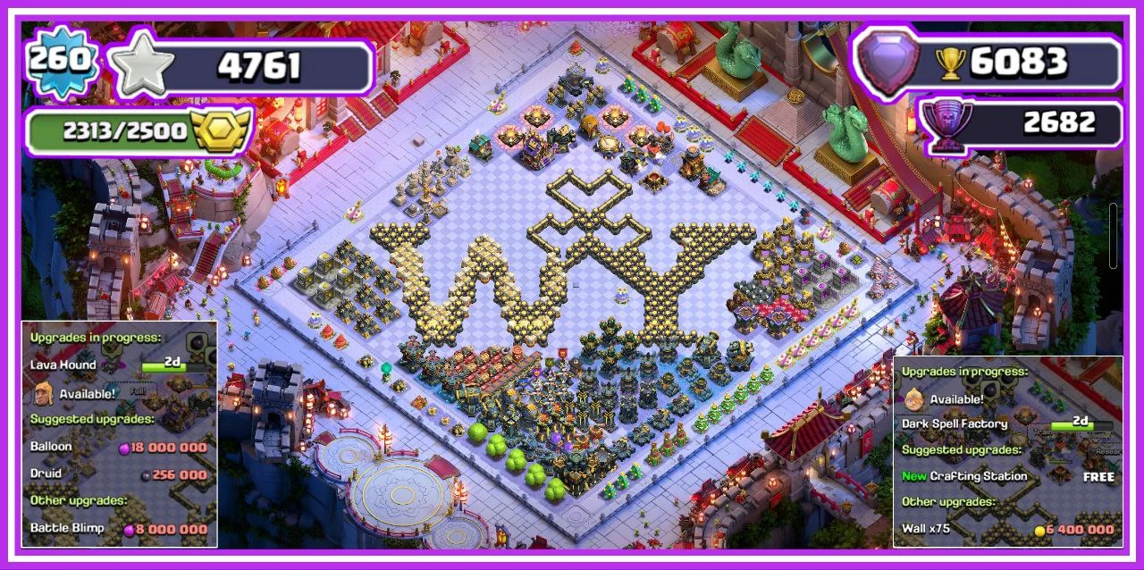 ✨️ COMPLETE CWL SET 💎 EVERY EQUIPMENT MAXED 🔥 FULLY MAXED TH 17 👑 ALL DEFENCES SUPERCHARGED 🐉 2x LEGENDARY SETS ☄️ GLOBAL RANK 1937 🎯 2.3K CWL MEDALS 🏅 OBSTACLES STACKED 🎄 5 SCENERIES & 25 HERO SKINS ❄️ 4.7K WAR STARS 🌟 100% MAX BUILDER BASE ✅️