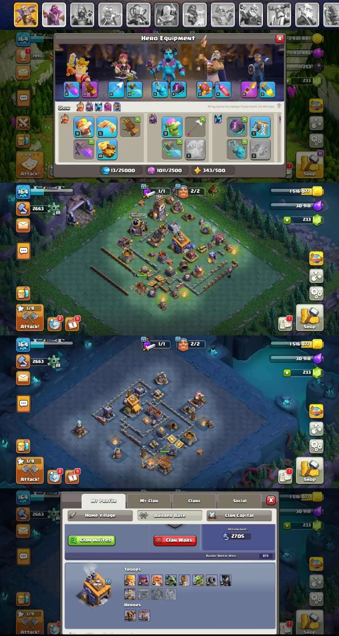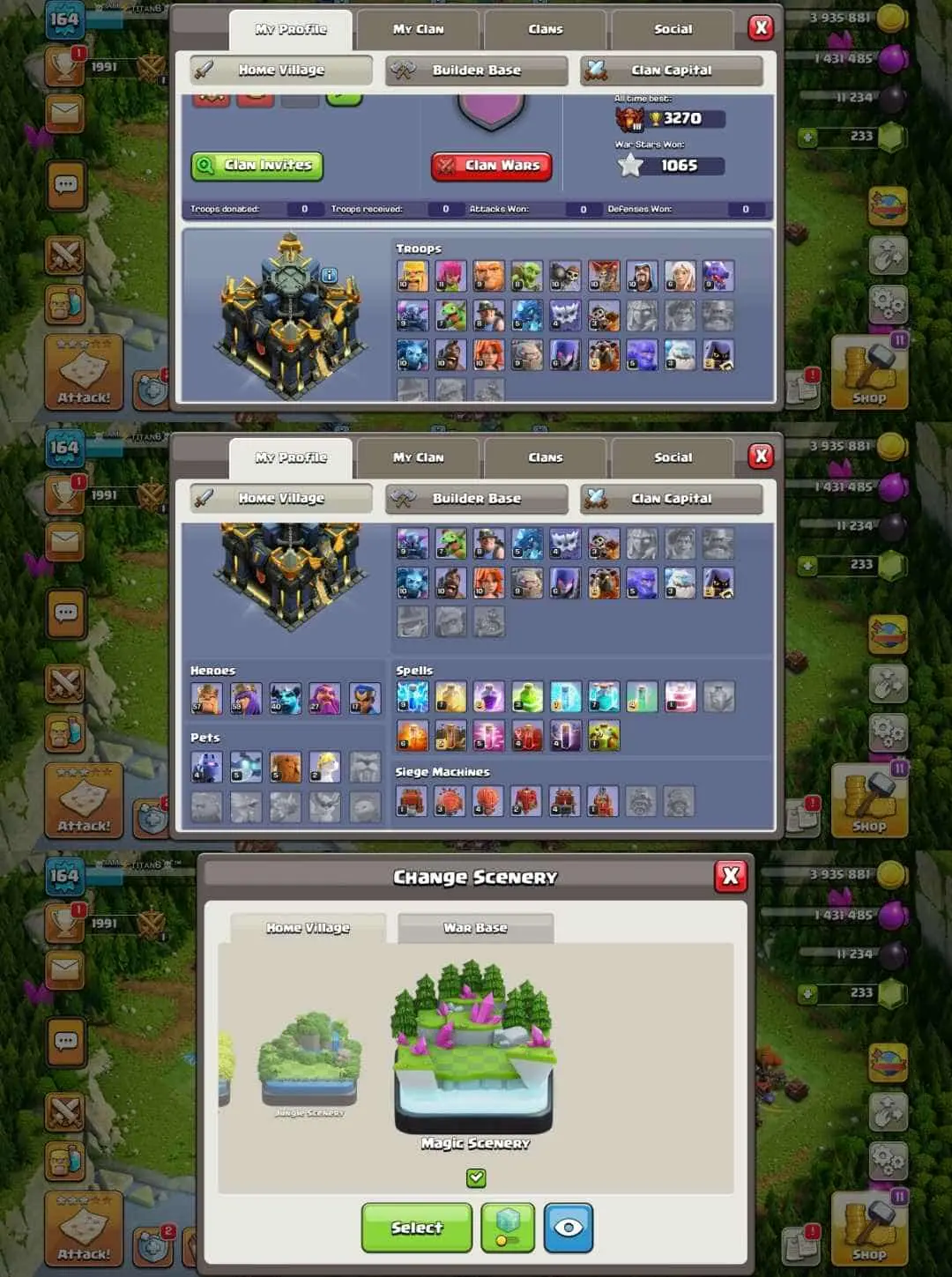 DARK BLUE WALL ➠GIANT GUNGLET(15) ➠ROCKET SPEAR (12) ➠MAGIC SCENERY ➠5 SKIN ➠HEROS: 57/59/40/27/17 ➠TH 17 ➠XP 164 ➠LOTS OF MAGIC ITEM