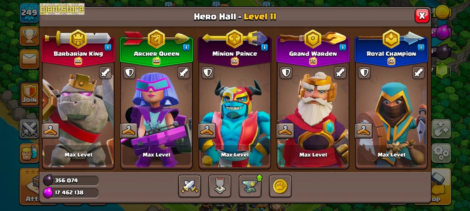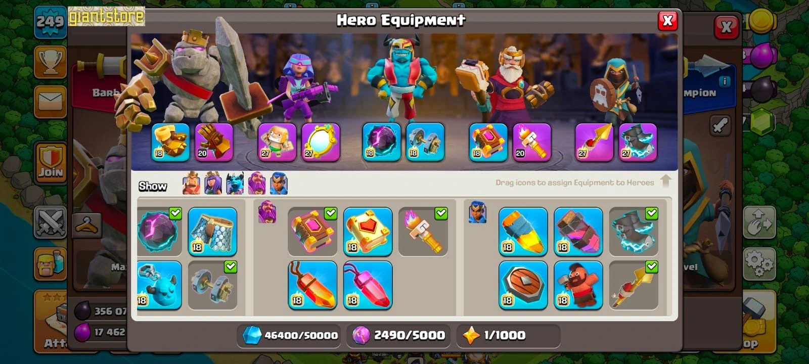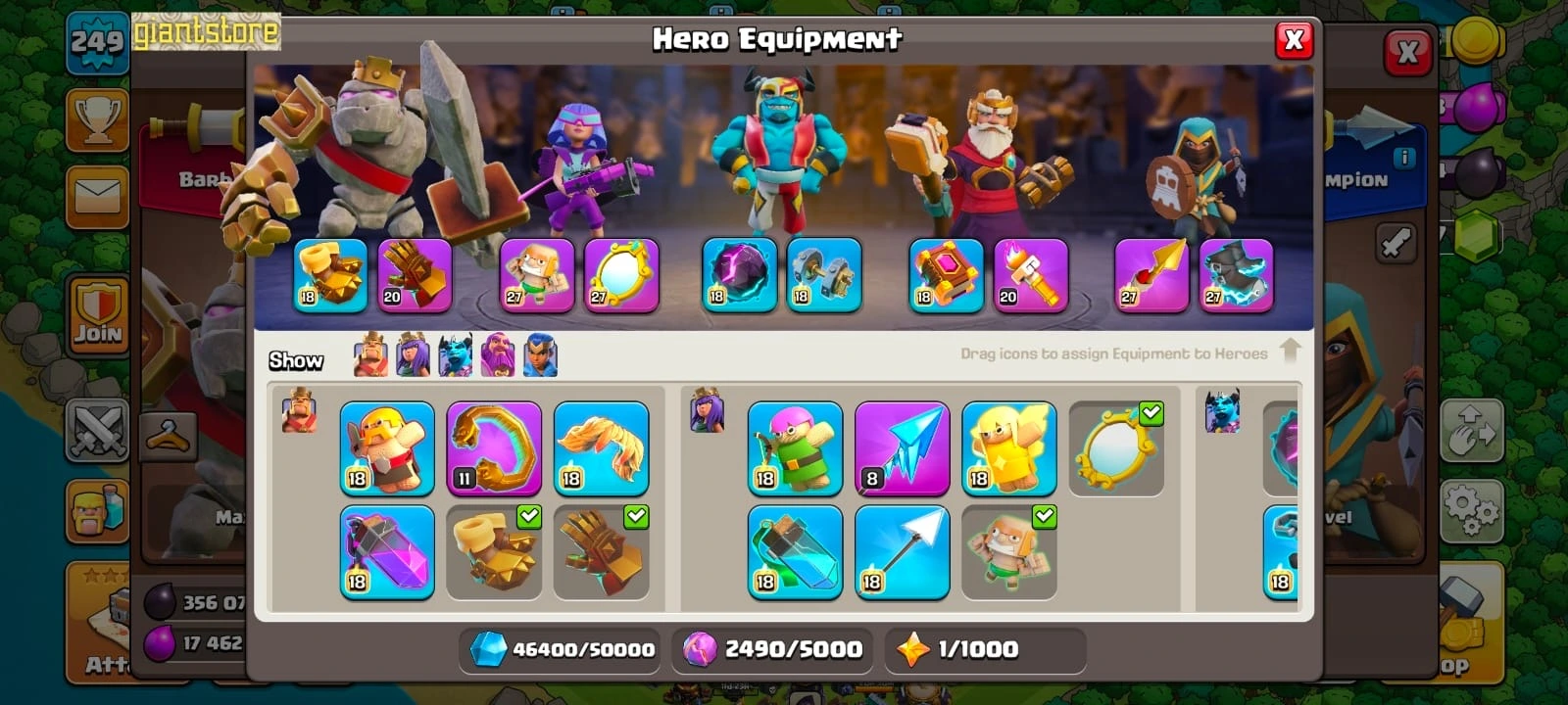 Rare☠️4 max epic equipment🔥TH 17 almost max🔥max heroes🔥max pets☠️8 epic equipment⚒️6 builder’s⭐️423 cwl medal✅war arena scenery and 8 heroes skin